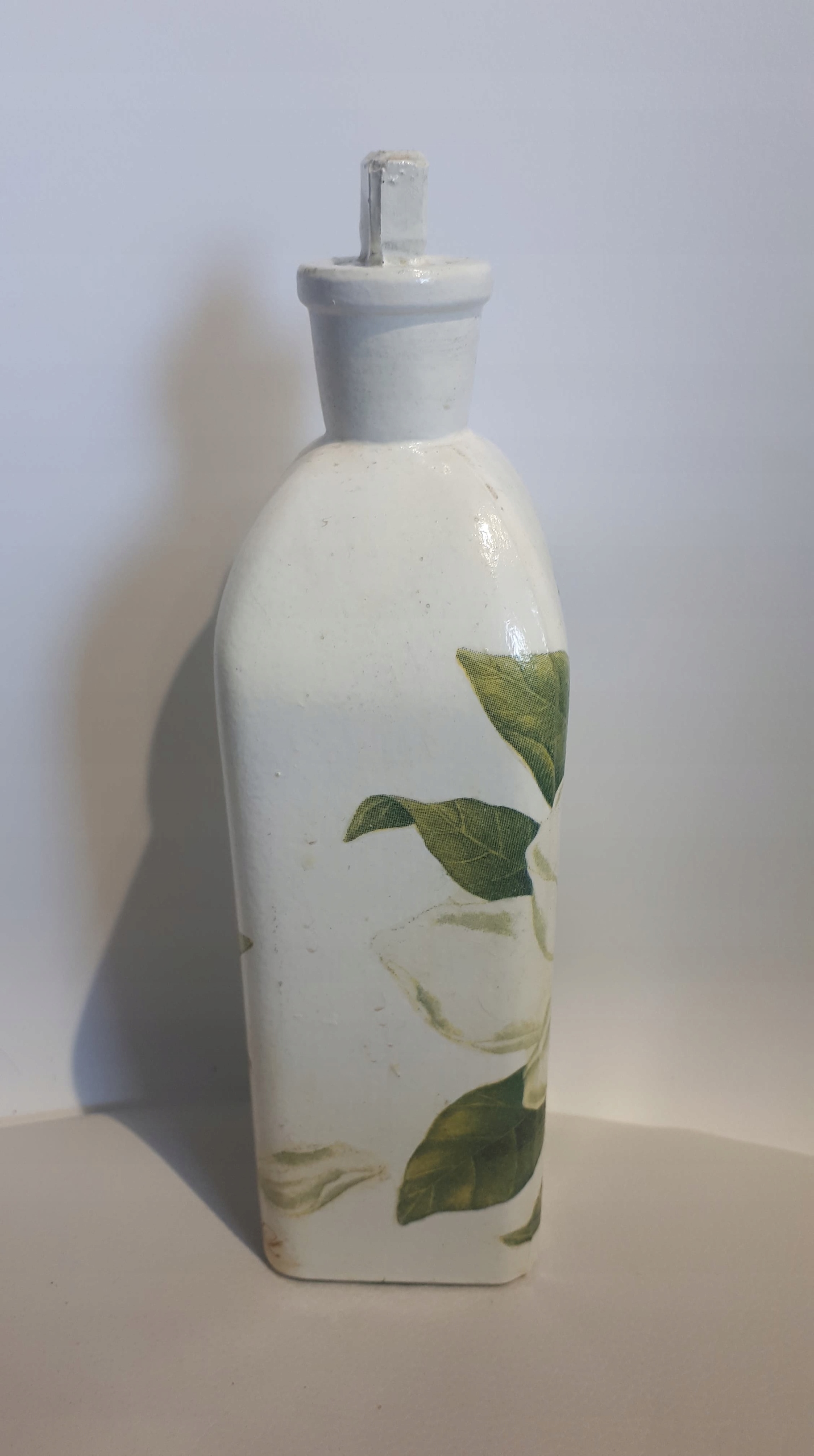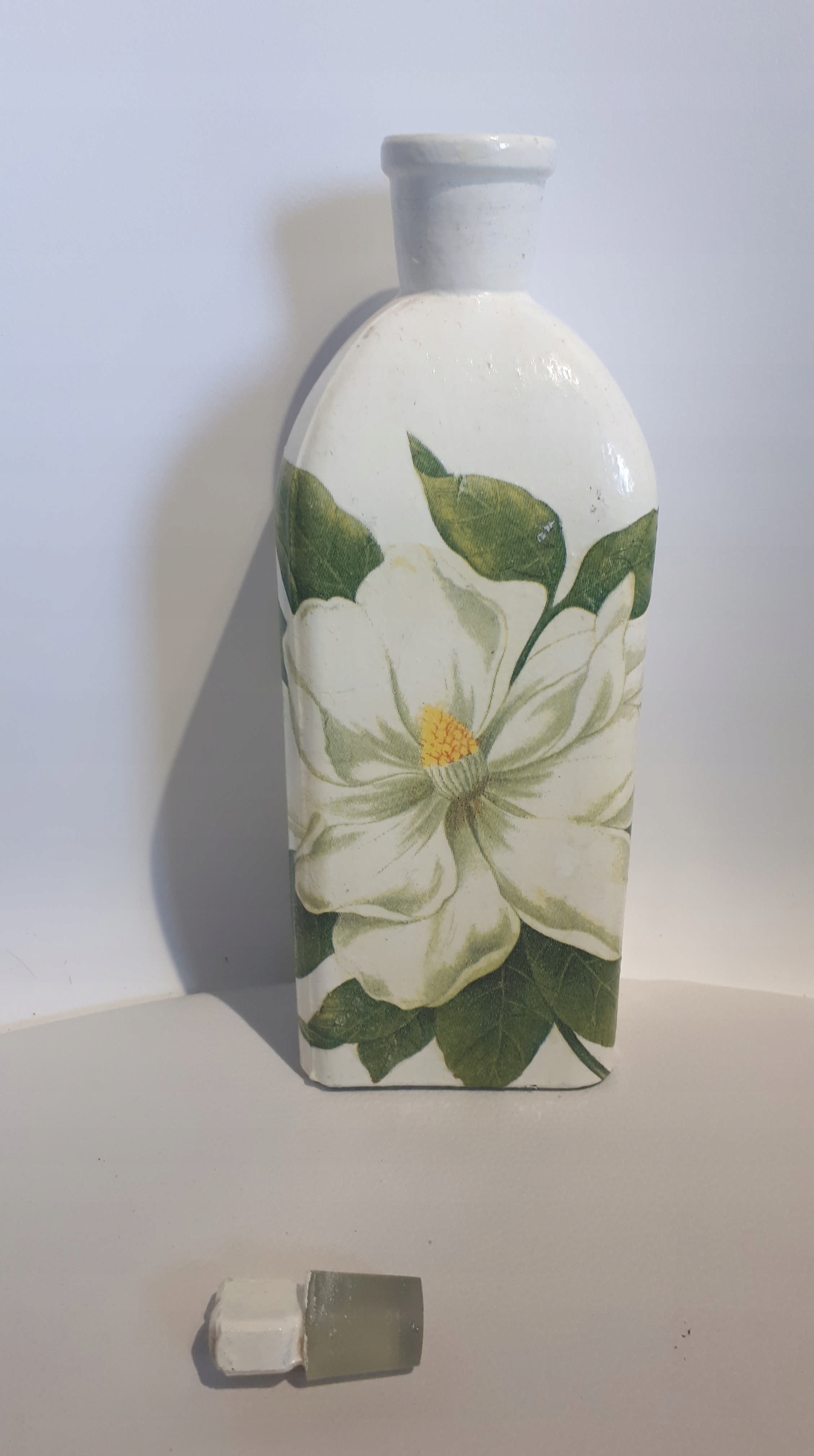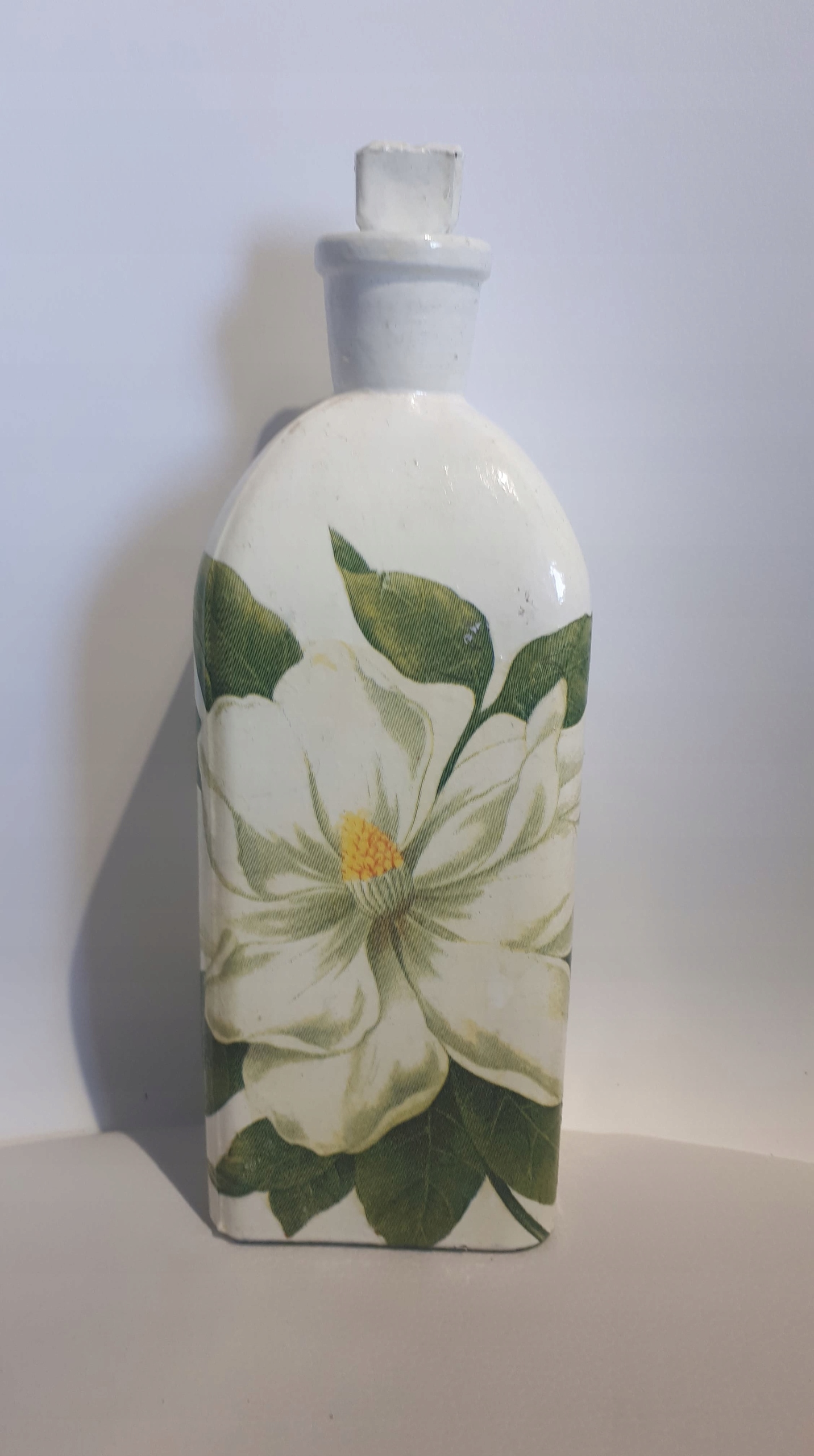 Стеклянная бутылка декорирована салфеточным методом, декупаж, закреплена прозрачным лаком.