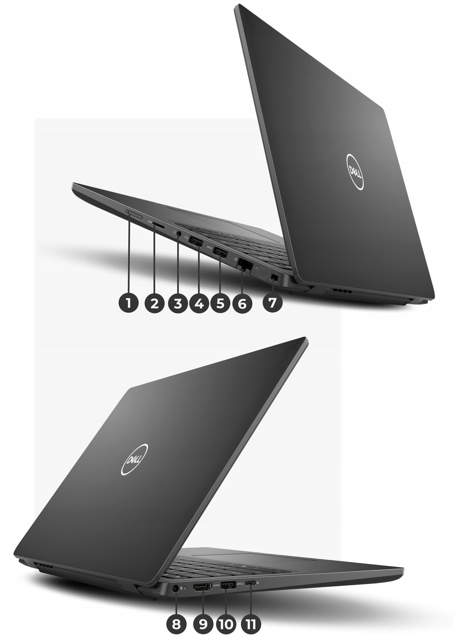 1. Устройство чтения SIM-карт (опционально — нет) 2. Устройство чтения карт памяти MicroSD 3. Аудиоразъем 4. Порт USB 2.0 5. Порт USB 3.2 Type-A Gen 1 6. Разъем RJ-45 7. Разъем для блокировки клавиш 8. Порт питания 9. Порт HDMI 1.4 10. Порт USB 3.2 Type-A Gen 1 с PowerShare < b >11. USB Type-C 3.2 Gen 2 с альтернативным режимом DisplayPort и функцией подачи питания