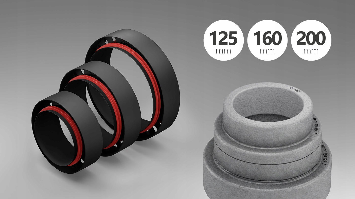 Система ARIA ADURO также оснащена трехступенчатым редуктором, позволяющим подключать каждый из трех доступных диаметров - 125, 160 или 200. Просто отрежьте соответствующую деталь. к неиспользуемому диаметру в соответствующем месте и получаем уменьшение 125 на 160 или 160 на 200. Также возможно построить установку рекуперации тепла только в каналах ADURO, в ситуациях, когда невозможно использовать распределительные коробки и трубы диаметром 75 мм.