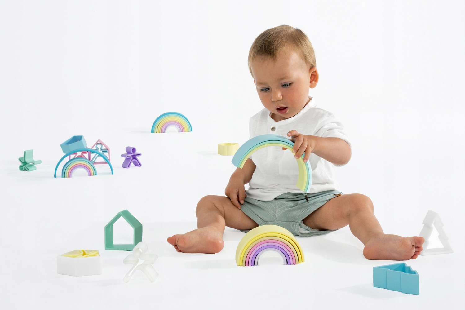 Радуга Дена – мотор, креативная игрушка и прорезыватель в одном! Изготовлен из мягкого силикона на основе платины, на 100% безопасен для детей. Его можно кусать, бросать, раздавливать, стоять на нем, играть в ванне, и все это безопасно и весело. Радуга — отличный помощник в изучении цветов и развитии словарного запаса. Эта игрушка предлагает множество способов игры! Его можно использовать для строительства первых построек, создания туннелей и гаражей для автомобилей. Детям понравится играть в нем с маленькой куклой или делать ручку для «животных». Укладывая арки друг на друга по-разному, мы добьемся потрясающей конструкции. Игрушки Dëna стимулируют творческие способности и воображение ребенка.