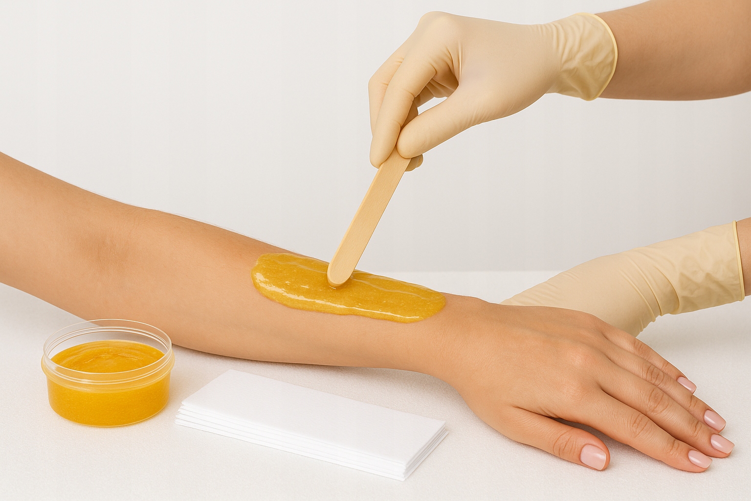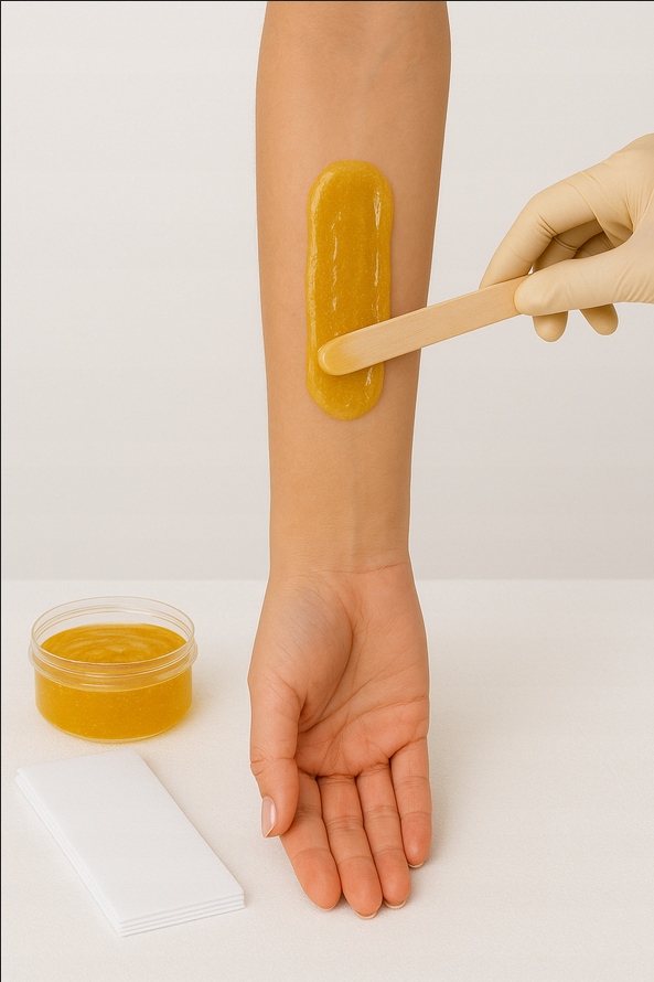 - Нанесите теплую, но не горячую пасту лопаточкой на кожу в направлении, противоположном направлению роста волос.