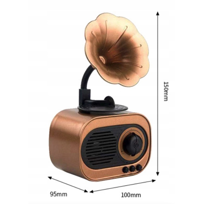 Динамика поддерживает режим FM. Вы можете слушать любимую радиостанцию где угодно. Более того, высокая производительность и емкость аккумулятора в сочетании с технологией Bluetooth 5.0 обеспечивают длительную бесперебойную работу по беспроводной связи до 20 часов. Все увенчано классическим декоративным рупором без динамика.