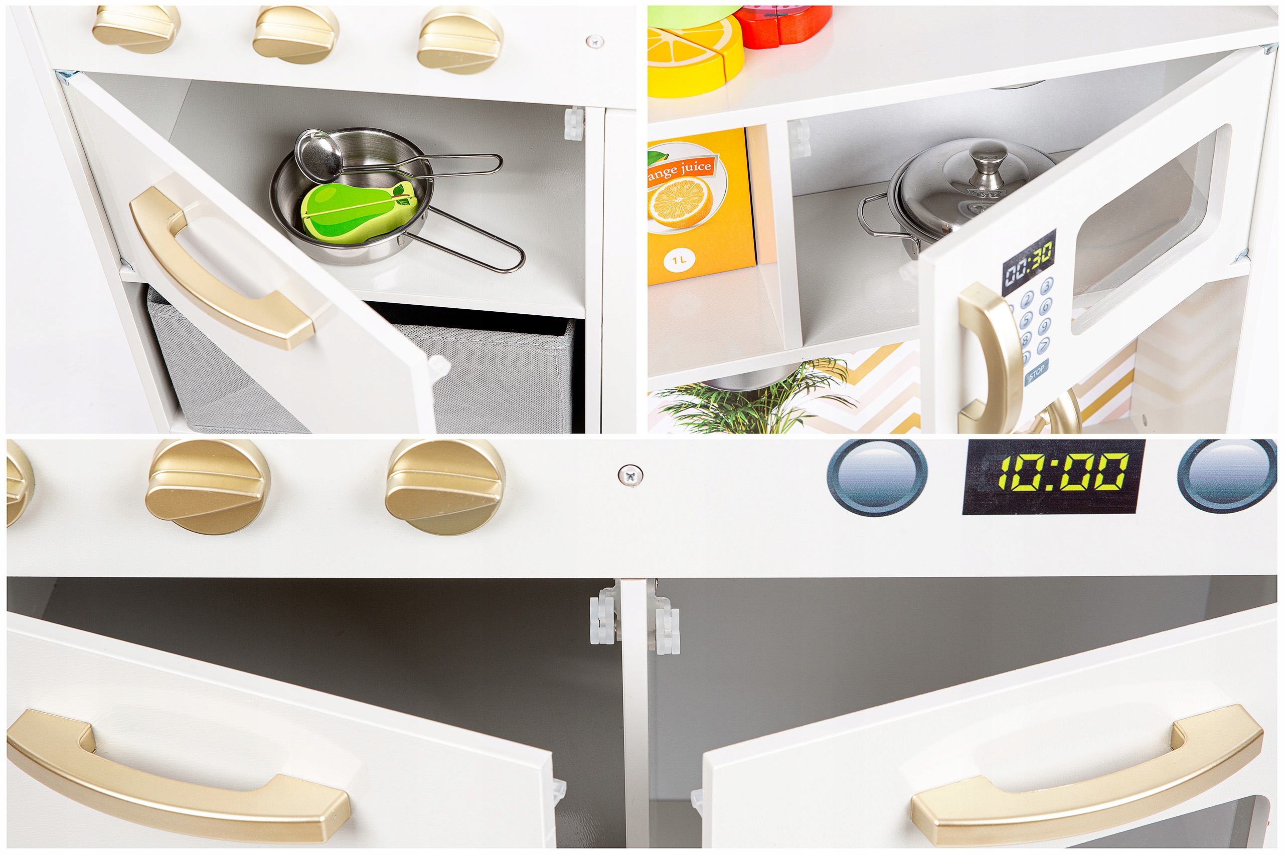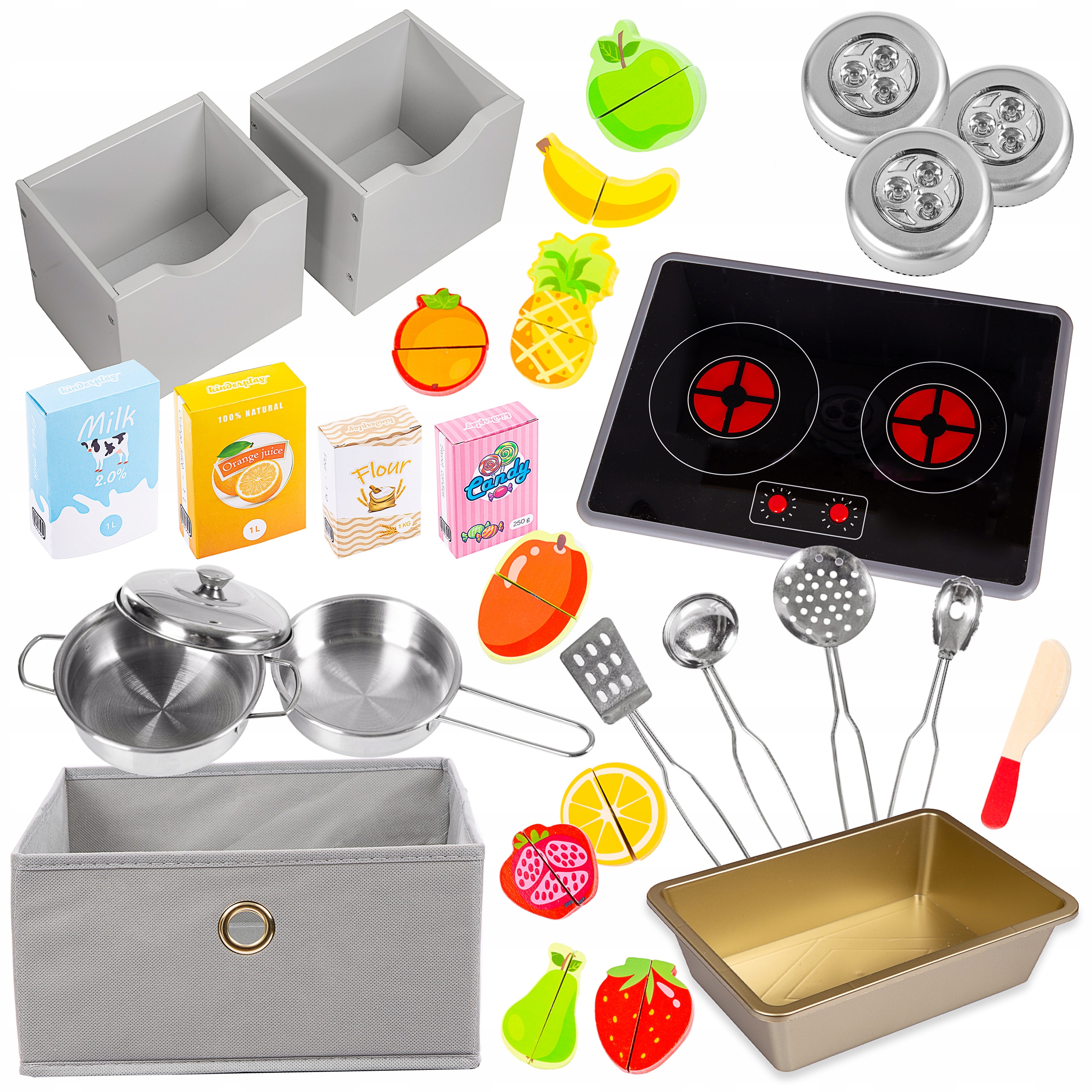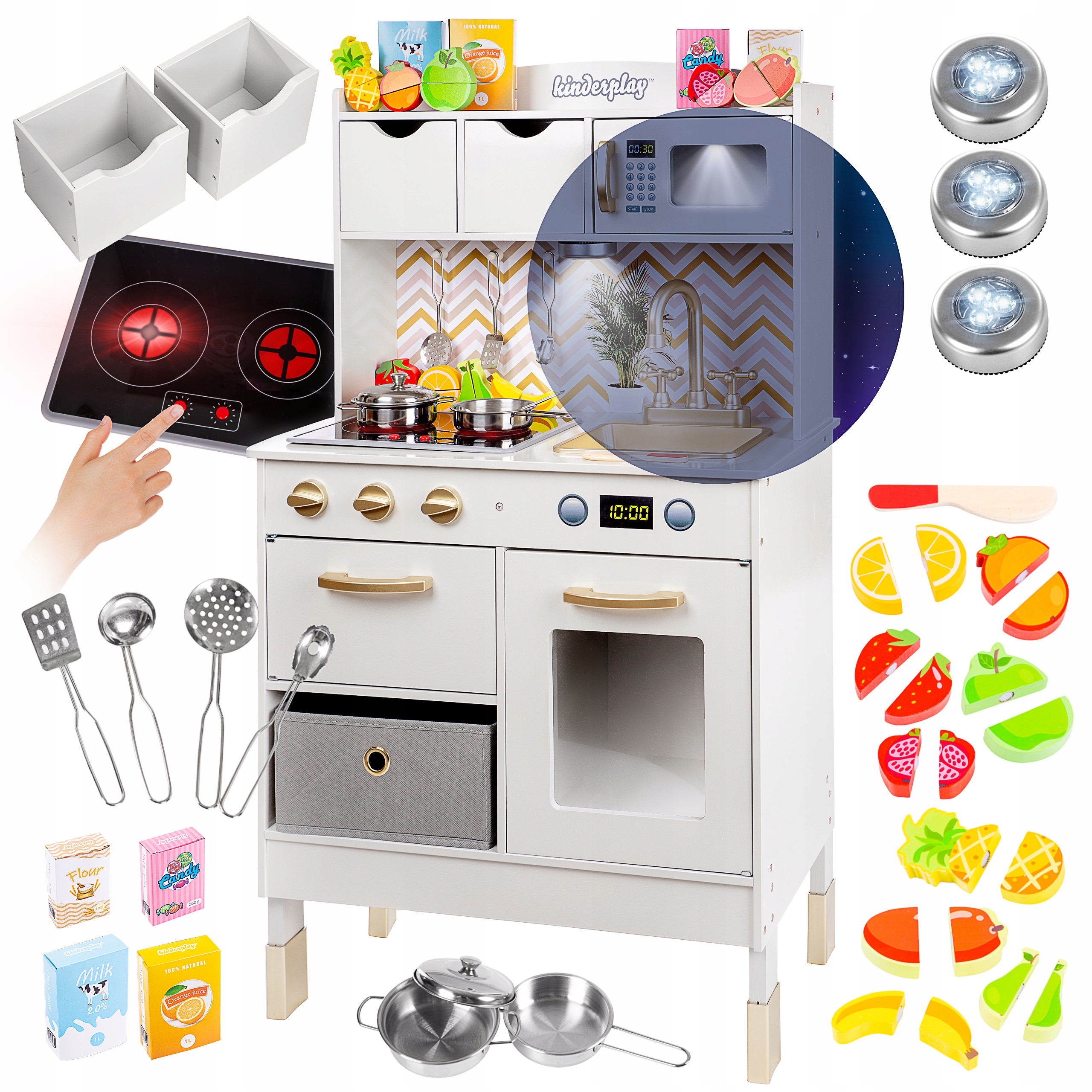 Этот набор способствует развитию мелкой моторики, координации рук, воображения и решению проблем. Кухня приятная на ощупь, острых краев нет. Полностью из дерева (небольшие пластиковые элементы: ручки, кран, раковина).