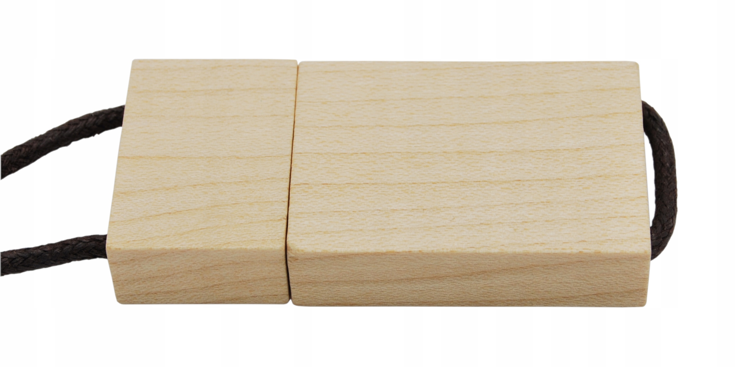 USB-накопитель заключен в прямоугольный деревянный корпус. Дополнительно имеется шнур, позволяющий повесить флешку на шею.