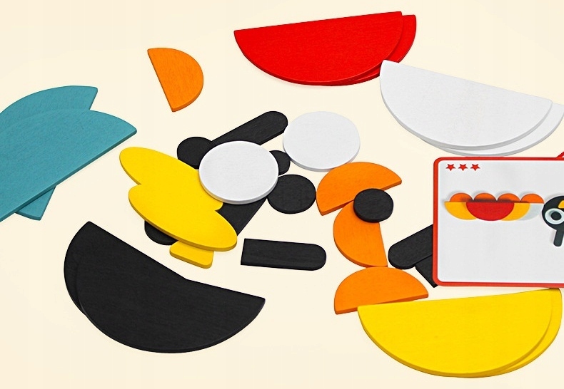 Набор состоит из деревянных кубиков различной формы и цвета, раскрашенных безопасными для детей красками и 20 карточек с заданиями - узоры для компоновки - разного уровня сложности.