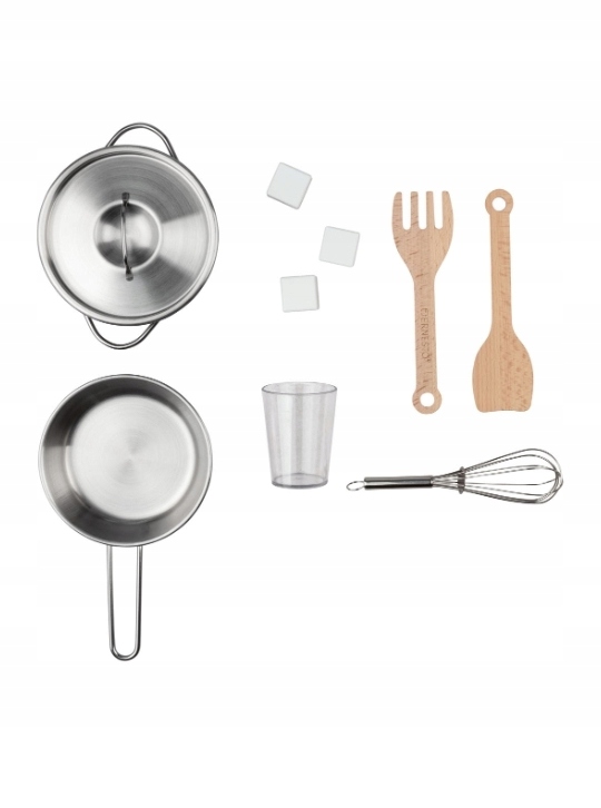 сковорода, кастрюля, крышка, подходящая для сковороды и кастрюли, вилка для мяса и лопатка марки «ERNESTO», а также венчик, фартук, кухонное полотенце, прихватка