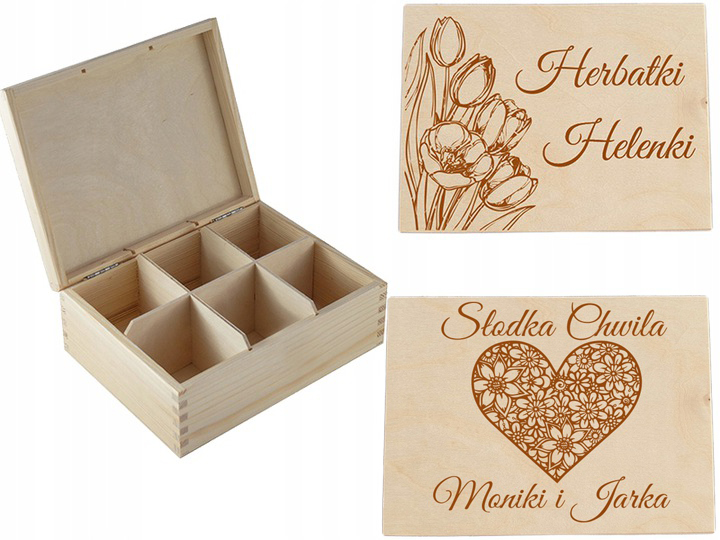 Универсальная шкатулка, в которой можно хранить различные безделушки, украшения или украшения. Деревянная шкатулка идеальна в качестве чайной коробки для подарка близкому человеку. Чайный пакетик можно наполнить шоколадом, конфетами, медом или другими лакомствами. Простая форма коробки дополнена индивидуальной гравировкой на крышке. Чайный шкаф из натурального дерева состоит из шести отделений, в которых любители чая могут разместить свою коллекцию. В коробке также можно разместить другие небольшие подарки, соответствующие выбранной гравюре и случаю, по которому они преподносятся.