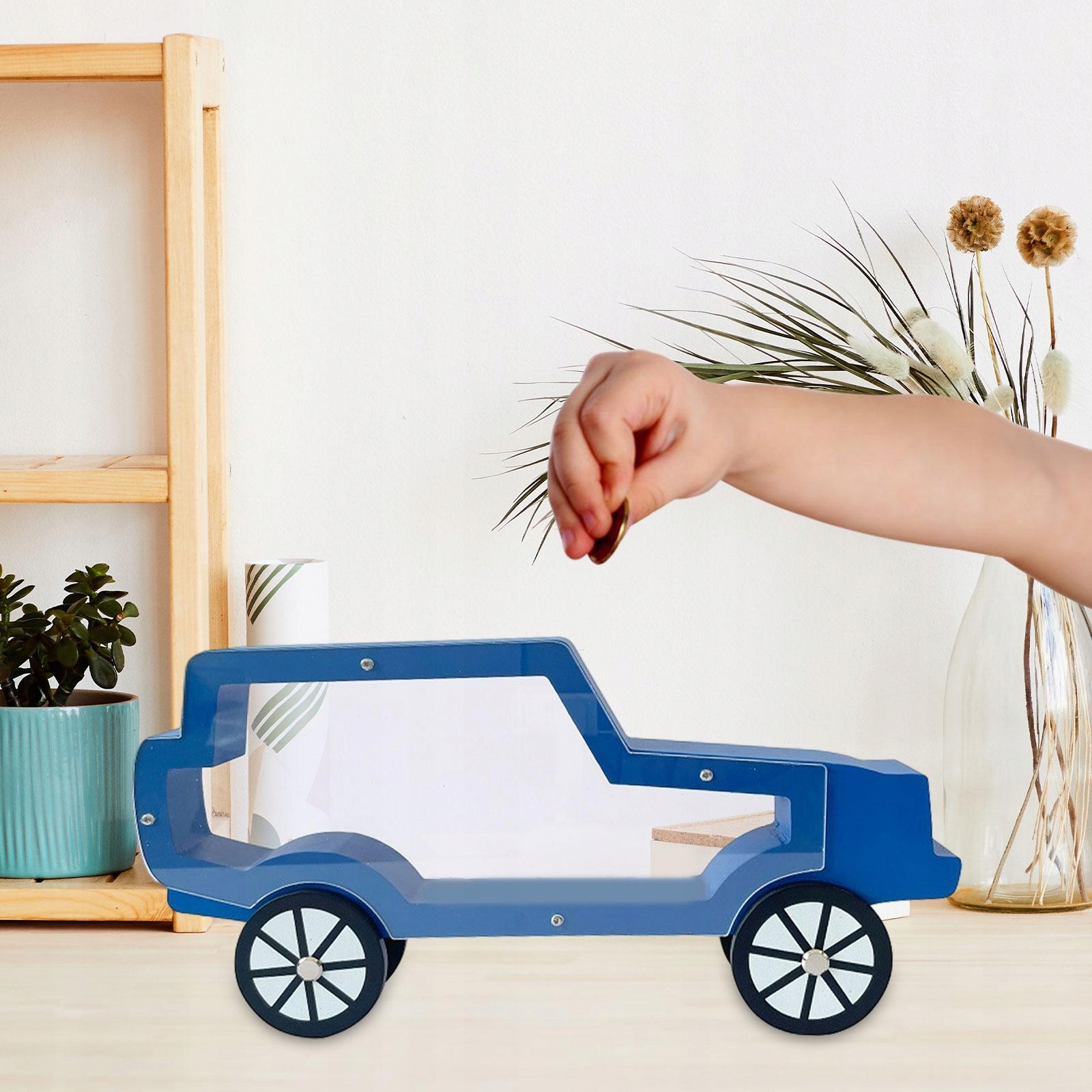 Деревянная креативная копилка в виде машинки. Креативная отвертка для открытия. Видимый синий