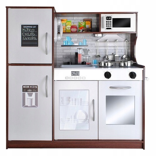- подсветка светодиод и звуки - на кухне есть светодиодная лампа, которую мы можем положить под шкаф, в шкаф или в духовку - выбор принадлежит вам! освещение заставит ребенка чувствовать себя на настоящей кухне , он получит еще больший эффект, когда в комнате уже темно, и лампа сделает ребенку приготовить кукольный ужин для кукол, плюшевого мишка или его родителей. Кроме того, горелки в плите при переключении ручек Snap ! Ваш ребенок будет в восторге - кухня позволит много часов развлечения. Горшок, кастрюля и крышка . Раковина в плите удаляется, ребенок/родитель может заполнить его водой, и после конца веселья мыть грязные блюда. Это вневременное предложение, которое порадовает каждого малыша. Благодаря классическому внешнему виду, он всегда наслаждается большим признанием. Чрезвычайно тщательное изготовление наряду с эстетической отделкой и вниманием к наименьшим деталям добавляет значения и приятно для глаз. Кухня также может успешно выполнять декоративную функцию и украсить детскую комнату. Вызывает увеличение ручных и актерских навыков, а также может стать вдохновением и способствовать успеху будущего шеф -повара . Материал: древесина; Цвет: темно -коричневый + белый; Питание лампы: 3 х аккумулятор ААА (не входит в комплект); Размеры: 80x80.5x24cm; Установить вес: 12,7 кг; Вес с упаковкой: 13,65 кг. 80x80.5x24cm