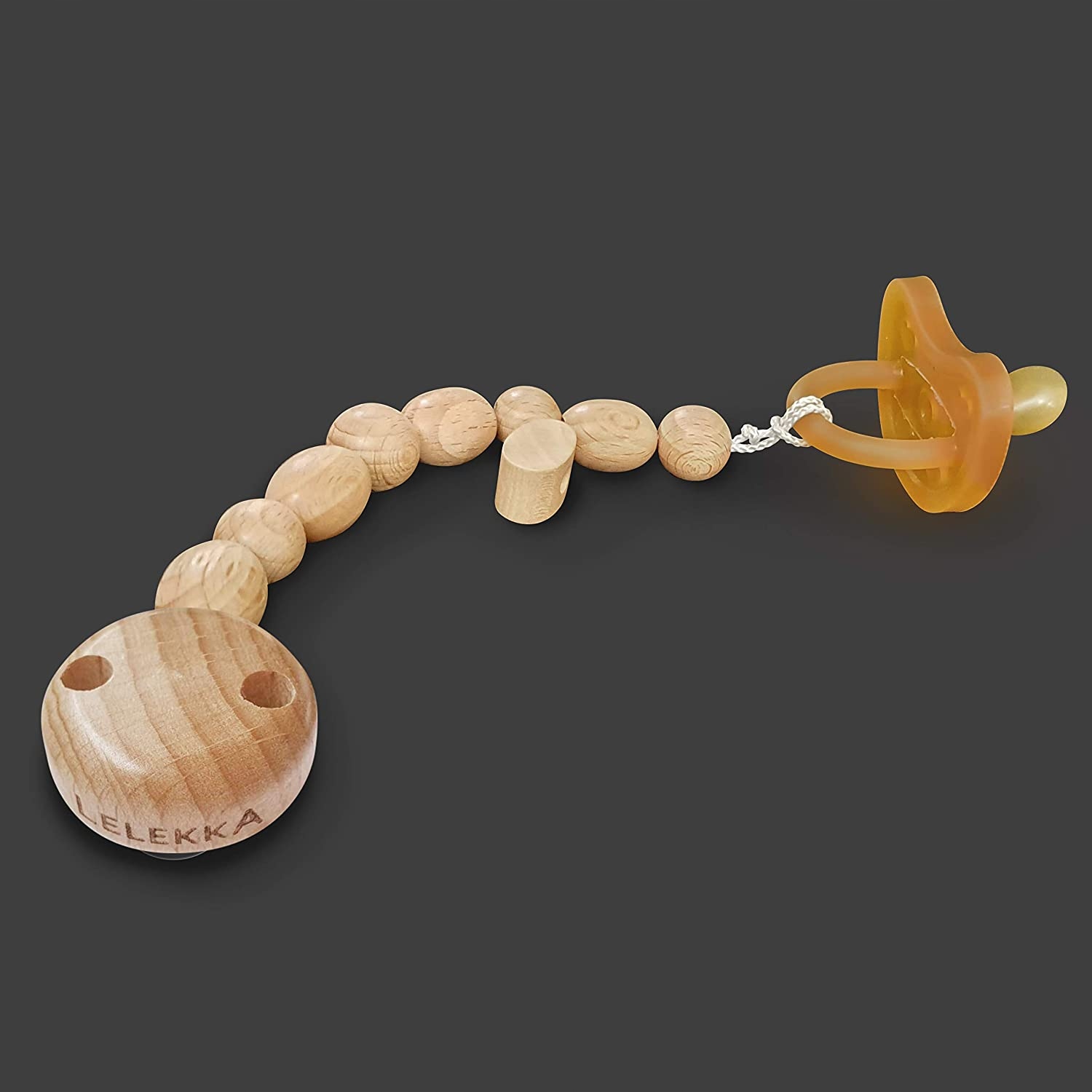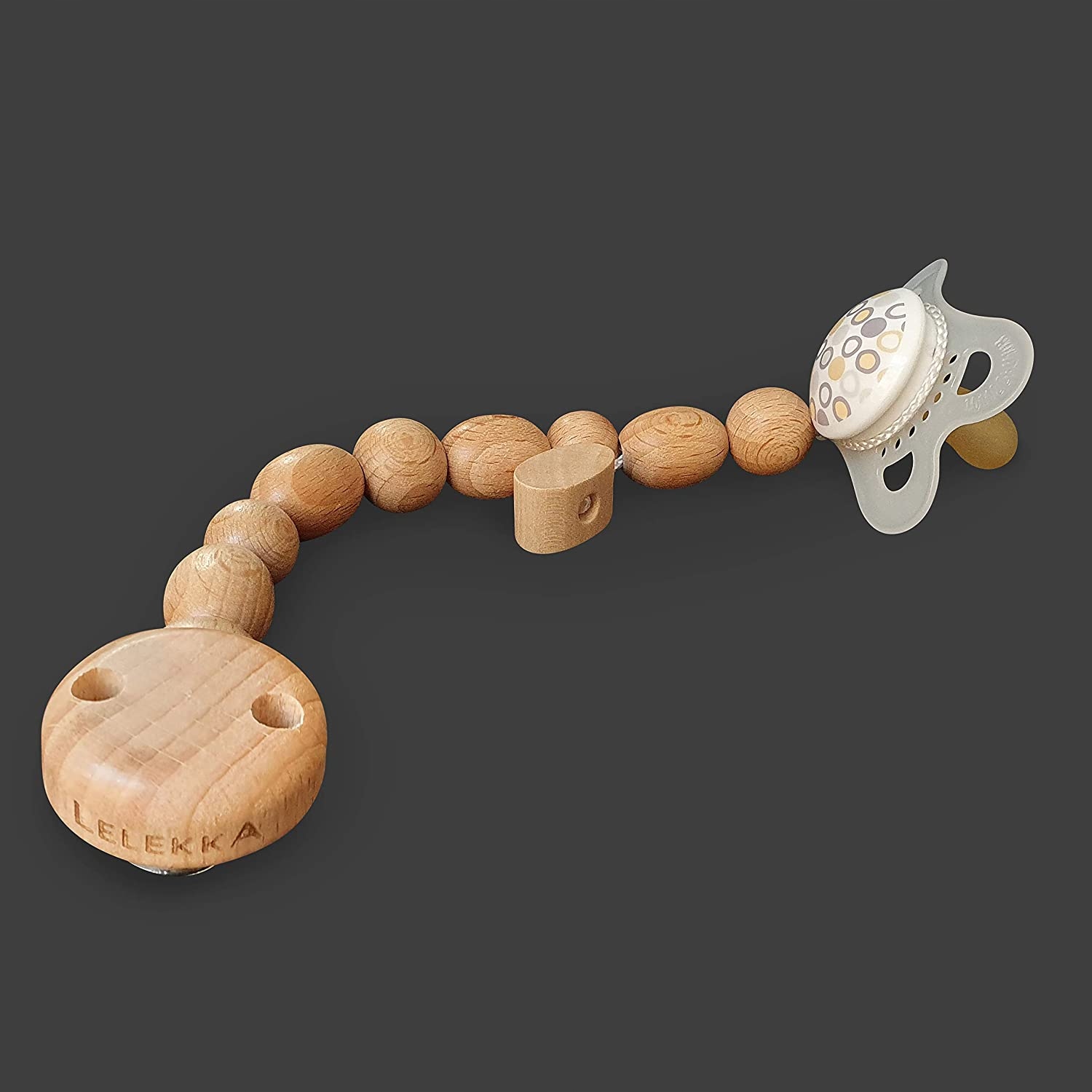 Декоративная цепочка с бусинами, которая позволит вашему ребенку всегда держать соску под рукой.
