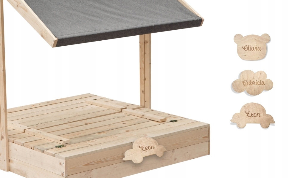 Дерев'яна ПІСОЧНИЦЯ, на замок, складна, з навісом + ІМПРЕГНАЦІЯ ІМ'Я ДИТИНИ