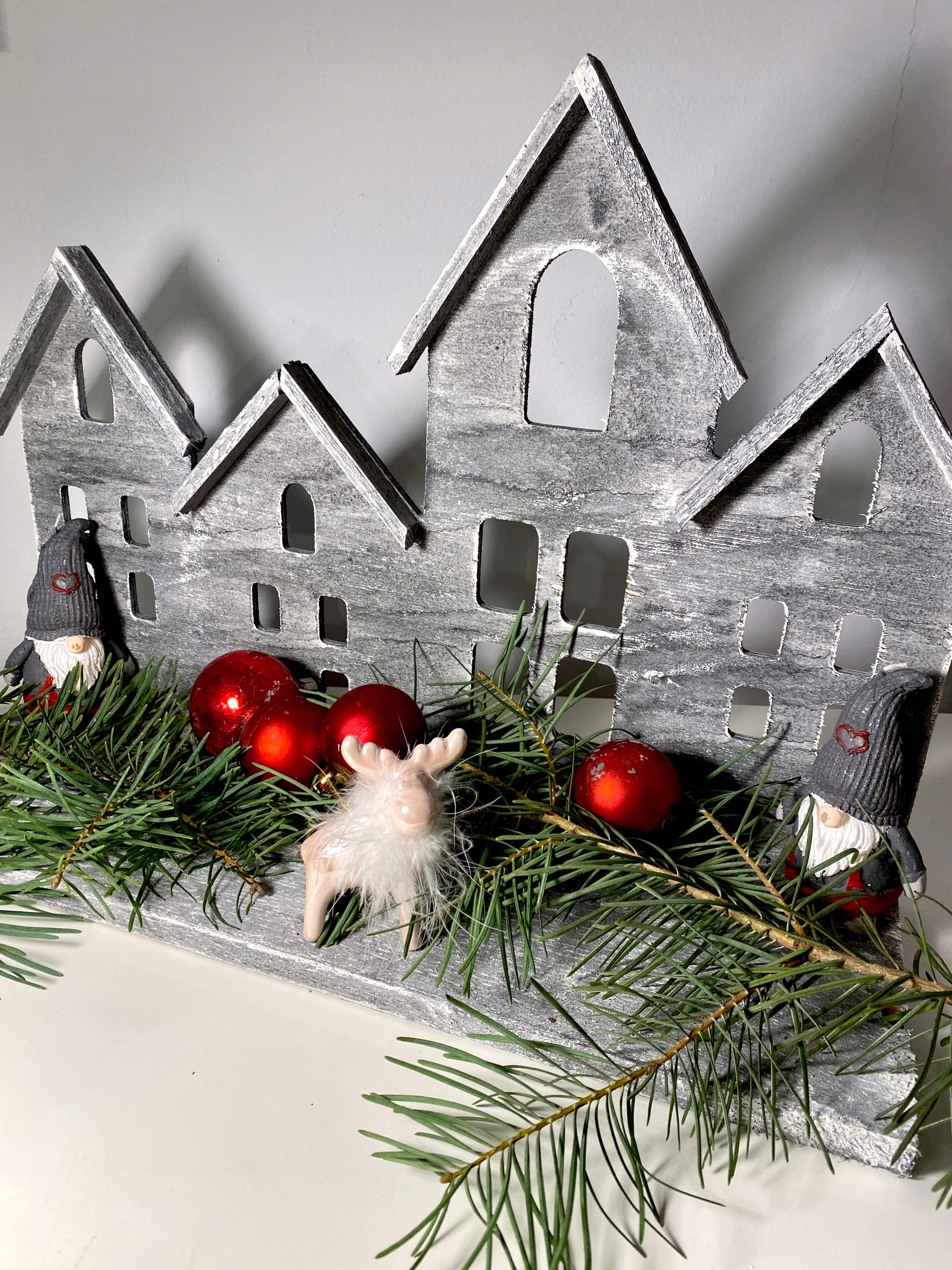 Дерев'яна прикраса з 4 сірими будинками, різдвяні прикраси