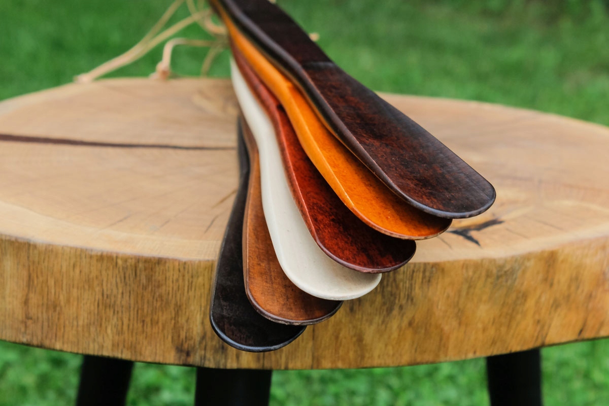 Оснащен петлей из кожаного ремешка, позволяющей подвешивать ложку.