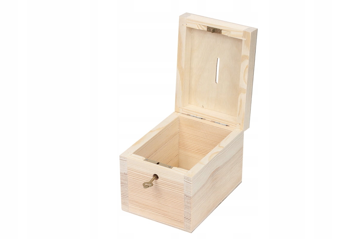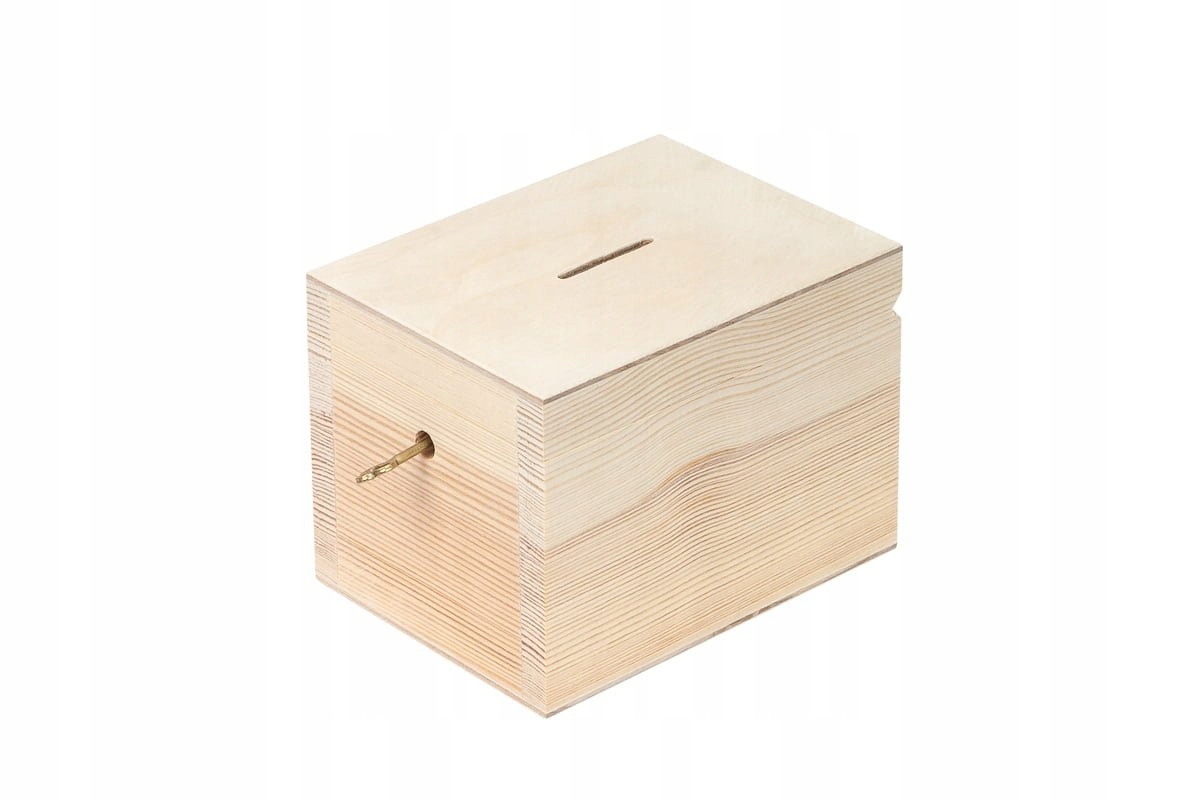 Копилка из древесины сосны и фанеры, неокрашенная. Ключ металлический.