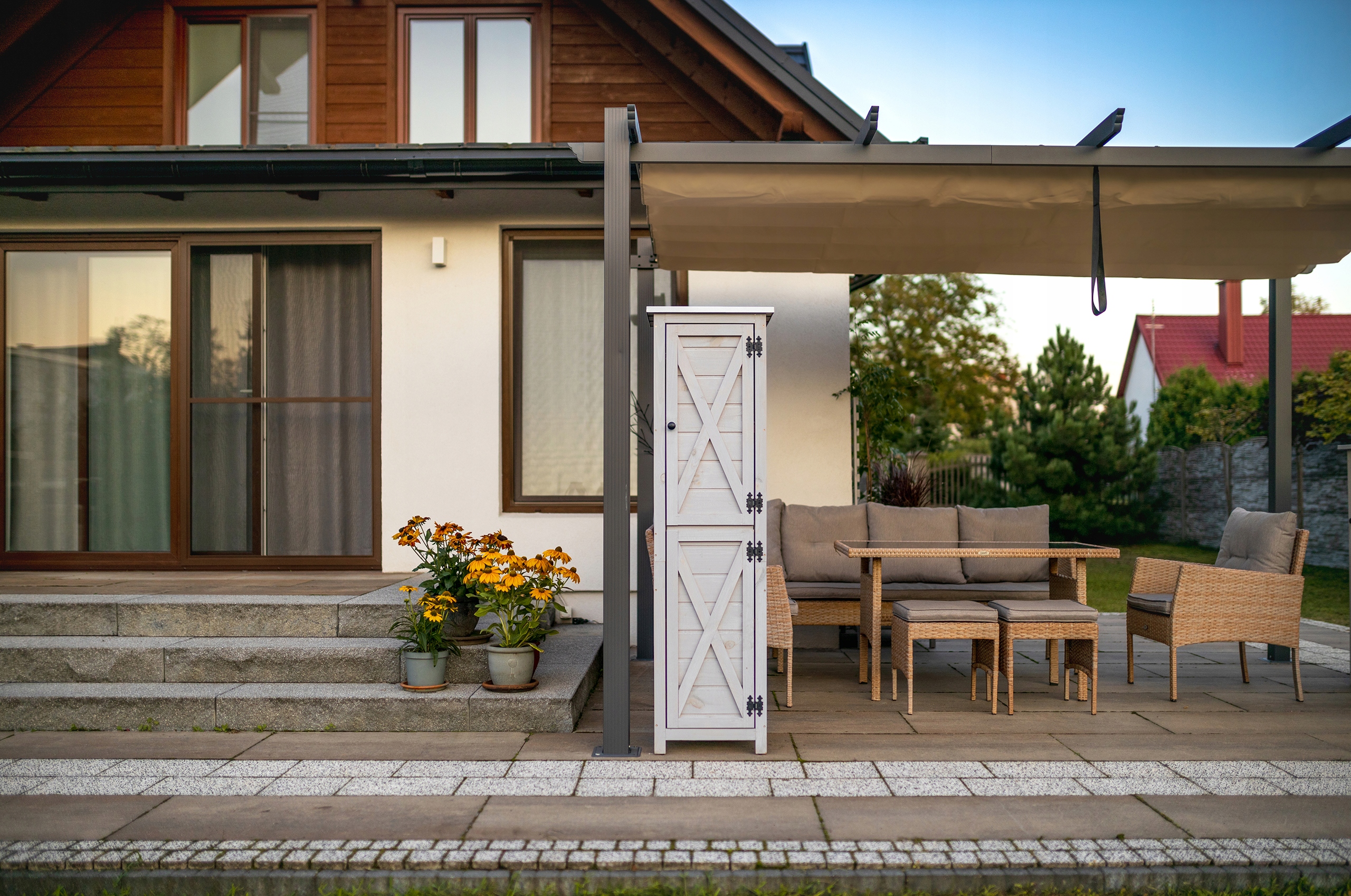 Благодаря твердым материалам, таким как пропитанное дерево и металл, мы обеспечиваем долговечность и прочность. Дерево добавляет тепла, а металлическое покрытие защищает шкаф от погодных условий. В шкафу есть место для хранения садовых инструментов, аксессуаров и подушек, что делает его идеальным местом для хранения вещей во время отдыха на свежем воздухе. Сочетание дерева и металла придает шкафу элегантный вид, привлекающий внимание и придающий саду уникальный характер.