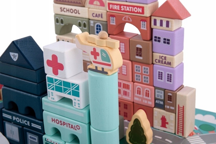 ДЕРЕВЯННЫЕ БЛОКИ ГОРОДСКИЕ МАШИНЫ ПОЛИЦИЯ БАНК 136 ЭЛЕМЕНТОВ + КОВРИК-ПАЗЗЛ