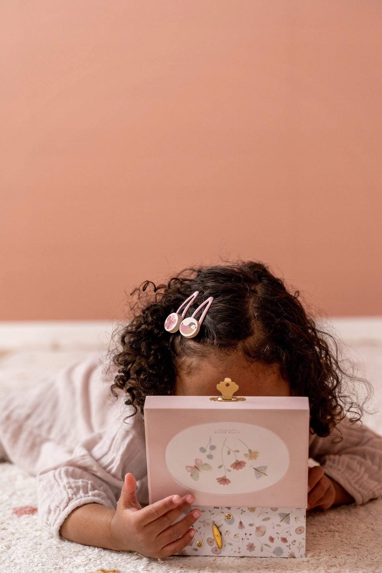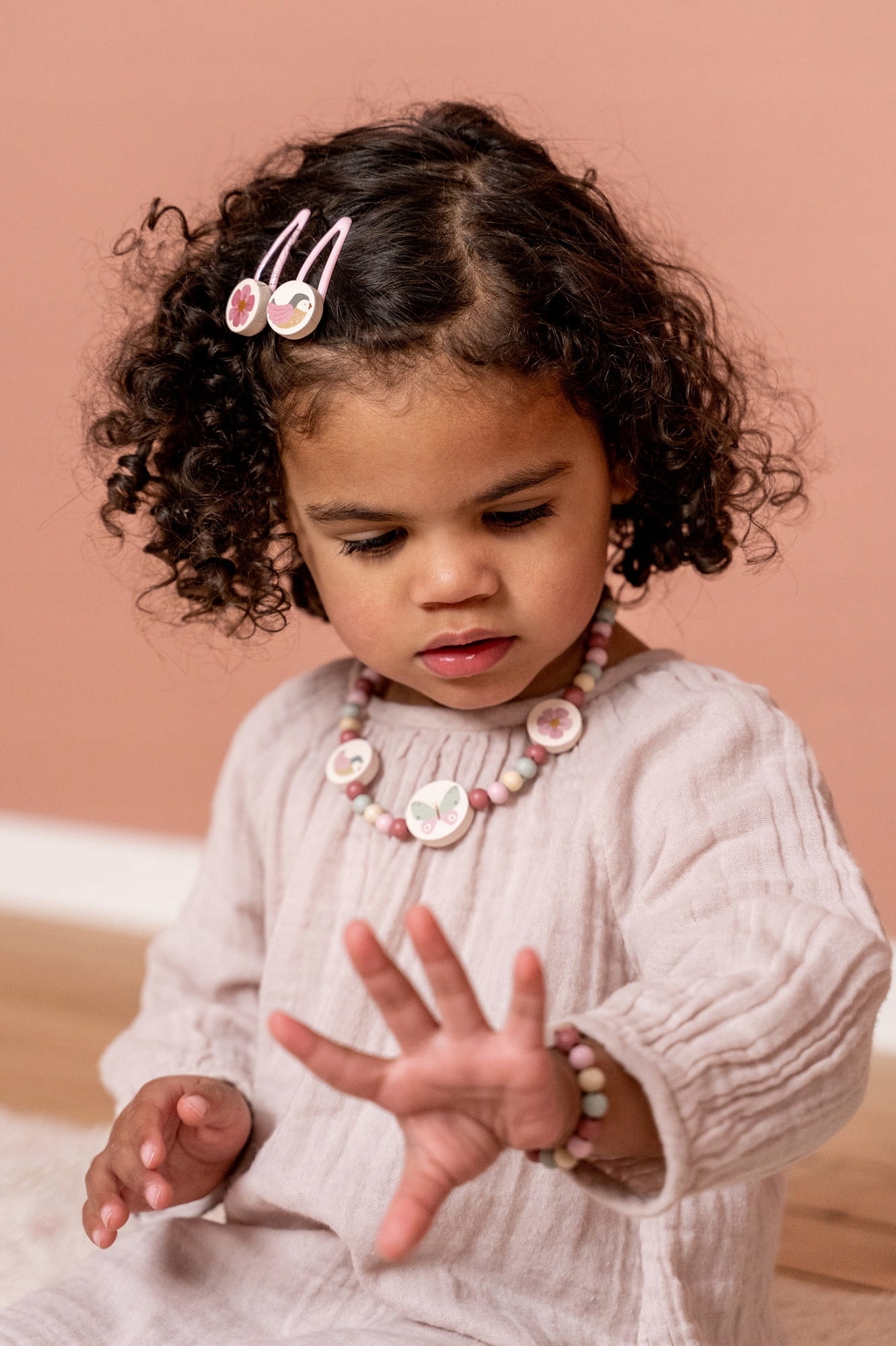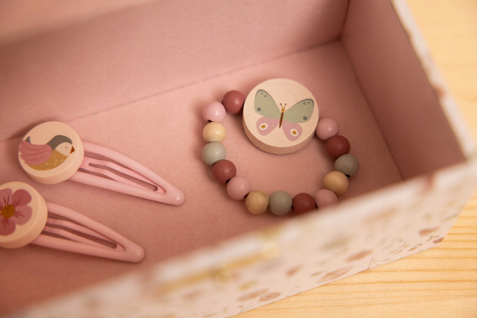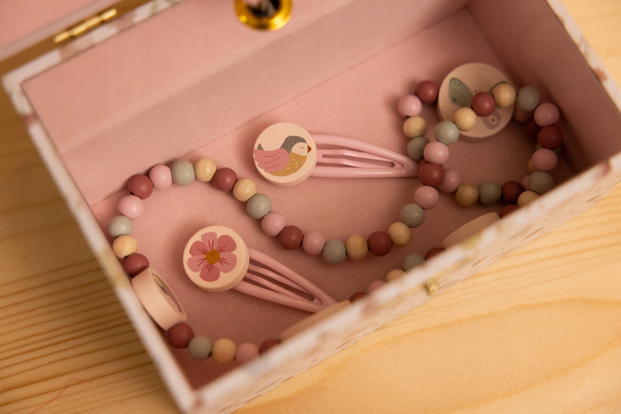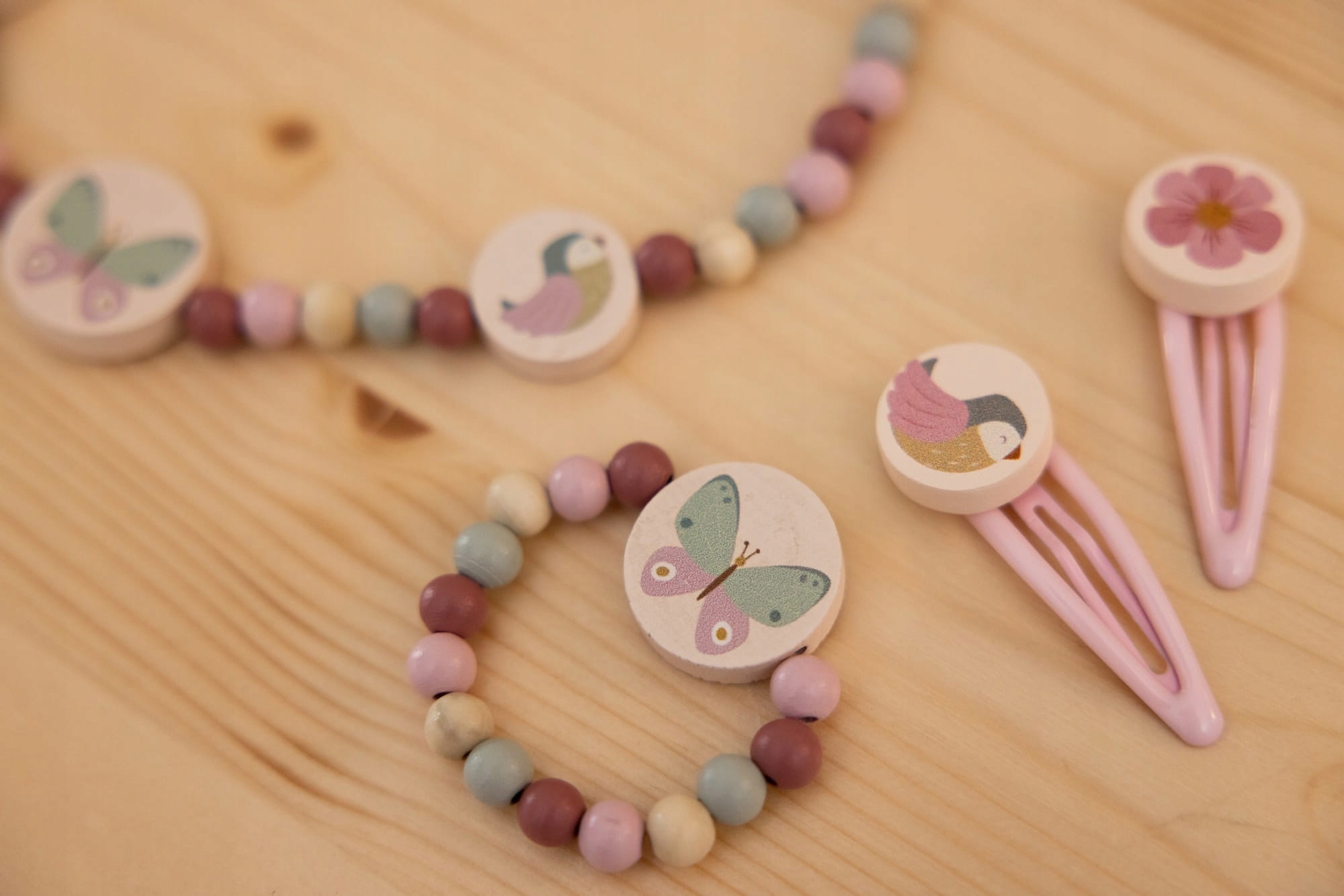 Маленький голландский комплект украшений Цветы и бабочки. В комплект входят ожерелье, две запонки и браслет, все в очаровательных пастельных тонах, с аксессуарами по мотивам Цветы и бабочки. коллекция . Набор изготовлен из дерева. Он станет прекрасным дополнением музыкальной шкатулки Rosa. Отличная идея подарка для каждой маленькой элегантной девочки.