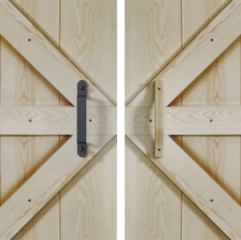 Деревянные раздвижные двери изготавливаются из древесины сосны с видимыми здоровыми сучками, прибитыми из одиночных цельных досок, расположенных вертикально. Им свойственны благородство и строгость формы, в частности подчеркивающие естественные качества древесины и сучков. Все модели отделаны черными видимыми шурупами, подчеркивающими их деревенский характер амбарных дверей. Кроме того, они представляют собой декоративный акцент. Двери прекрасно смотрятся в классических, современных и деревенских интерьерах.