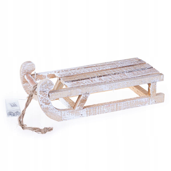 Сани из дерева, беленые. Дефекты окраски являются намеренно и призваны визуально состарить изделие. Они красиво смотрятся в композициях, а также как самостоятельное украшение. 25 светодиодных ламп дополнительно создают теплую, уютную атмосферу. Оснащен таймером, который позволяет легко продлить срок службы батареи и предотвращает постоянное включение и выключение.