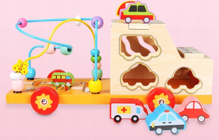 ГРУЗОВИК С МАШИНКАМИ — деревянный сортер со счетами, который будет развивать у вашего ребенка координацию и логическое мышление. В игре нужно подбирать разных животных к соответствующим лункам. Всего для соответствия формам используются 3 стенки автомобиля. Блоки легко снимаются.