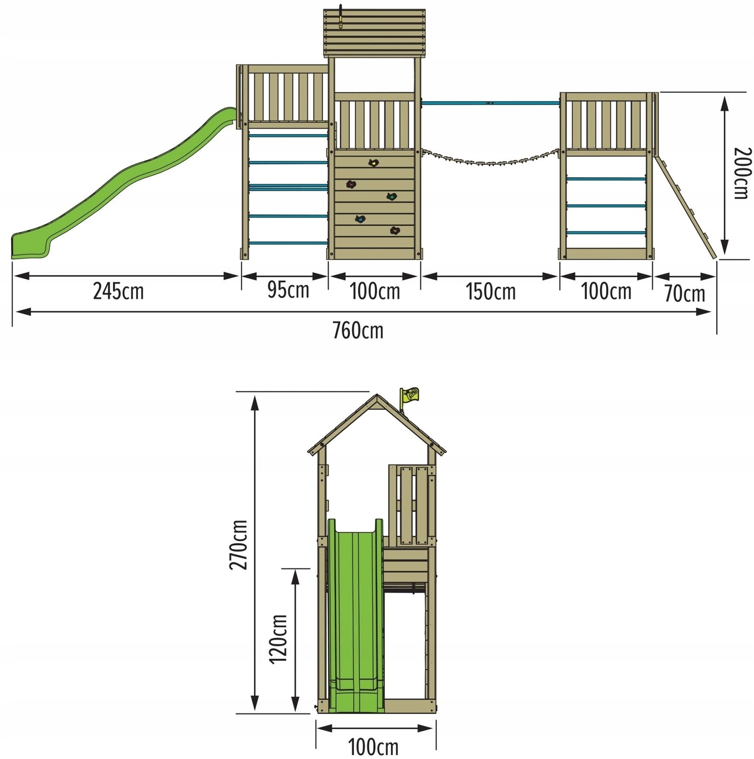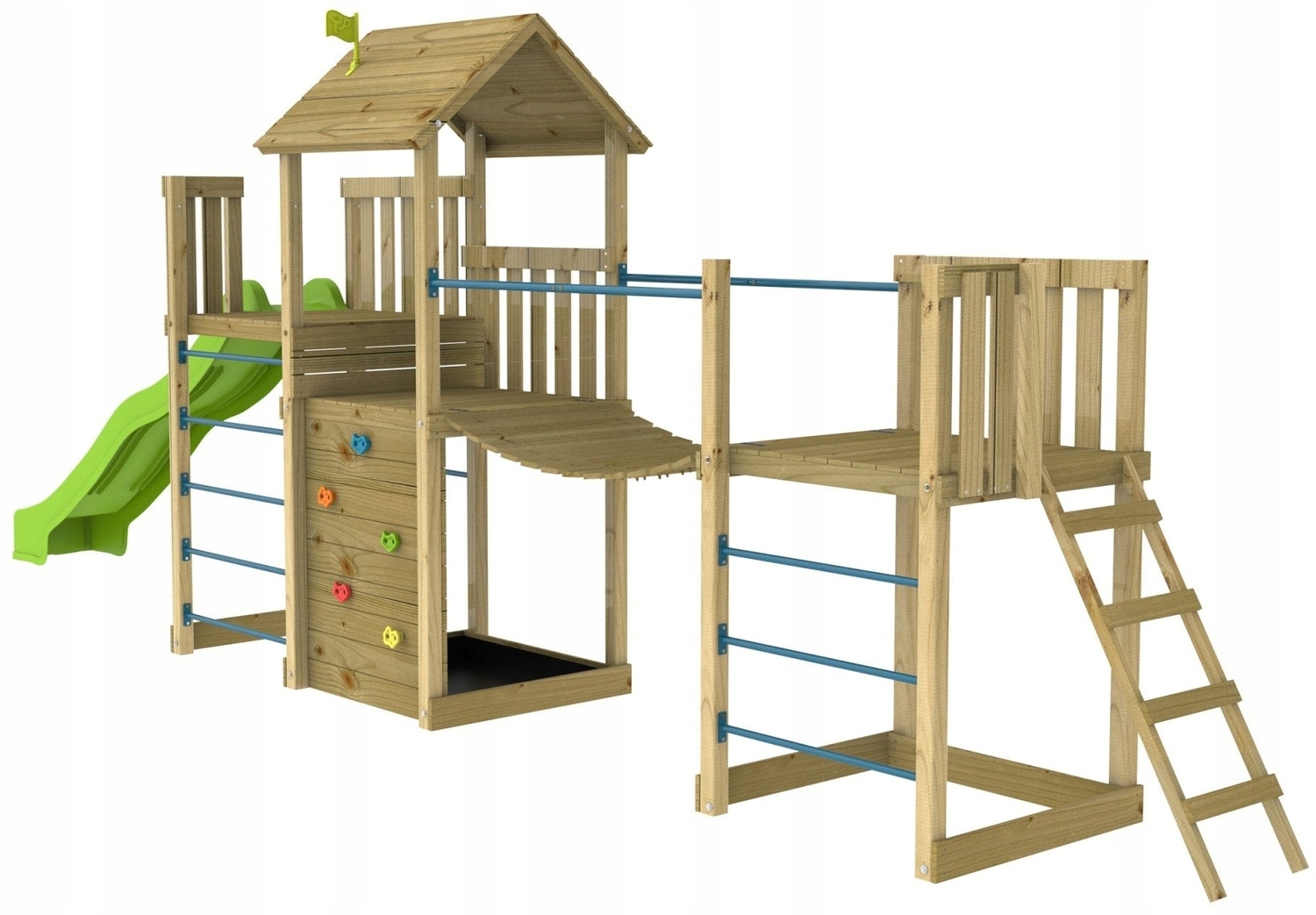 Строительство состоит из естественного, сертифицированного дерева fsc , что придает ей уютный вид. Игровая площадка удобна и предлагает много места для игры. Пол платформы облицован прочными досками. максимальный общий вес пользователей Playground составляет 150 кг . Благодаря этому у детей будет большое, сильное, удобное и безопасное место для игры.