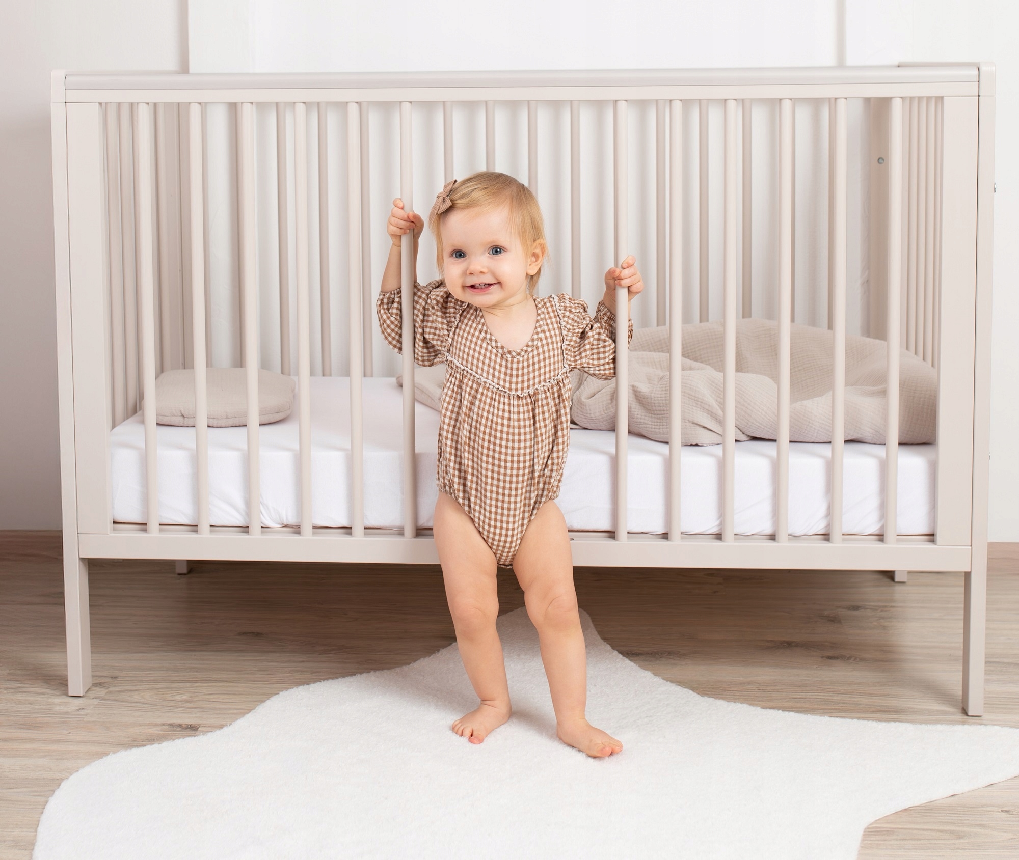 Благодаря практичным чехлам, размещенным на длинных сторонах, мебель защищена от повреждений – и следы первых зубов, которые может оставить ребенок, стоя в кроватке :)