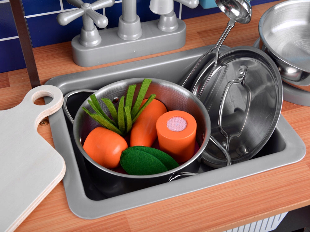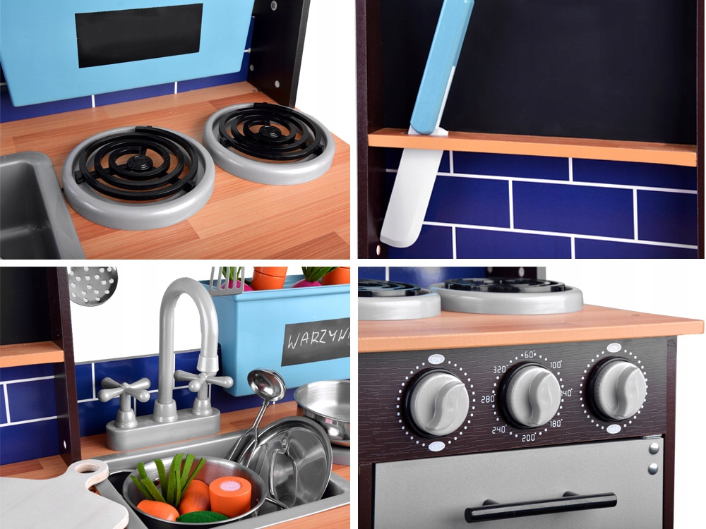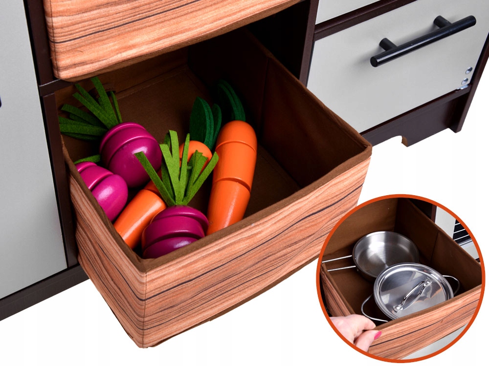 - Деревянная кухня в стиле Лофт наверняка понравится и детям, и родителям. Кухня в реальной жизни невероятно впечатляет, в ней хочется готовить, оставаться там, готовить, резать (и что угодно). Деревянная кухня с множеством дополнений и аксессуаров удовлетворит требования многих кулинаров-виртуозов. Играть с готовкой – сплошное удовольствие, а на такой кухне – просто удовольствие! Дети часто любят подражать взрослым, и в такой кухне у меня создается впечатление, что они будут проводить время вместе со взрослыми :) За что мы хвалим эту кухню: - уникальный внешний вид (дерево в сочетании с серым, оно просто сочетается друг с другом) - холодильник со светодиодной подсветкой - льдогенератор со звуком и световым эффектом - глубокая мойка - серый смеситель с кранами - круглые, стильные конфорки - три крана, издающие при повороте характерный звук, скрипящий звук - вешалки для половников, лопаточек, шумовок - полка для ножей - черная доска для мела, например для записи блюда дня - духовка со светодиодной подсветкой - открывающийся шкаф для кастрюль - пластиковый контейнер для овощей - две корзины под дерево - детали: отделка под кирпич В комплект входят: - металлическая сковорода с ручкой - кастрюля с крышкой - половник - ложка-шезлонг - лопаточка - деревянная разделочная доска - деревянный нож - пластиковый контейнер для овощей - коричневая подкладка для контейнера - две тканевые корзины - овощи для нарезки на липучке: морковь 3 шт., свекла красная 3 шт.