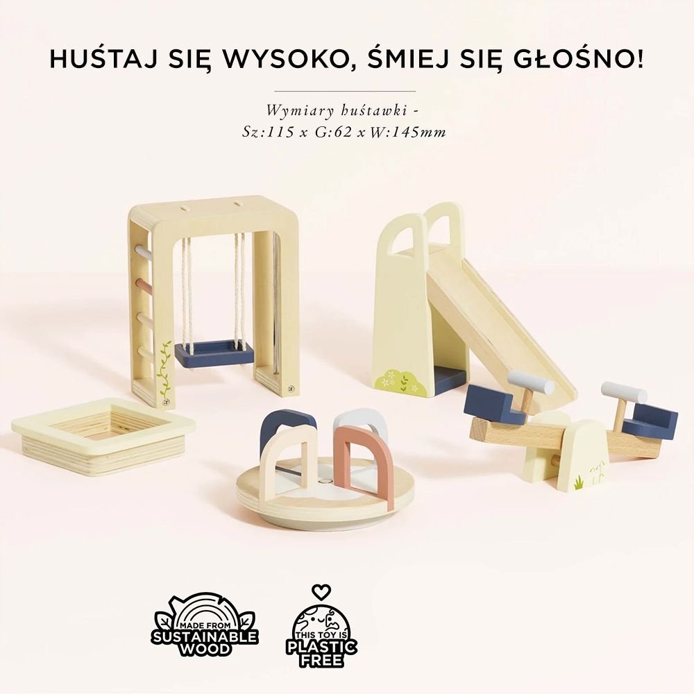 Вот идеальное дополнение к кукольному дому или независимому веселью - деревянной кукол детской площадки! Этот 5-элементный набор был тщательно разработан, чтобы разбудить детское воображение и наслаждаться еще большей радостью от творческого веселья с куклами. Он содержит карусель, песочницу, гравитационное качели, слайд и скалолазание с качелями на канатах. Хуурра!