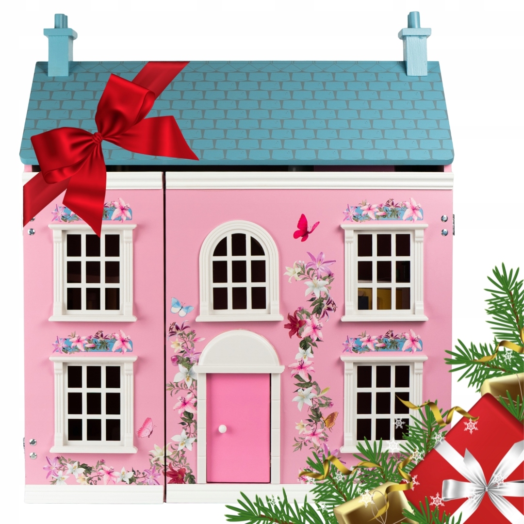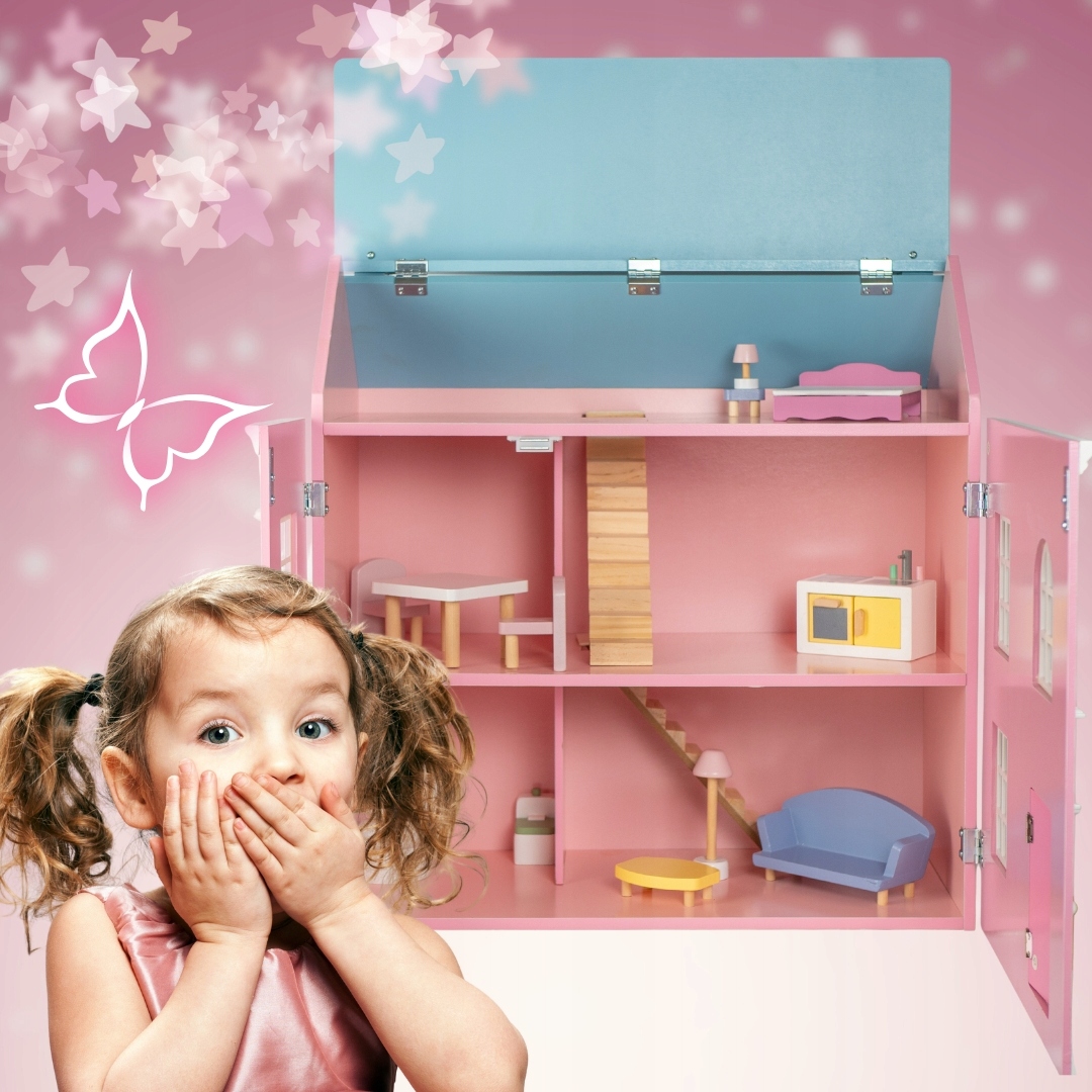 КРАСИВЫЙ ДЕРЕВЯННЫЙ КУКОЛЬНЫЙ ДОМ С ОТКРЫВАЮЩЕЙСЯ МЕБЕЛЬЮ