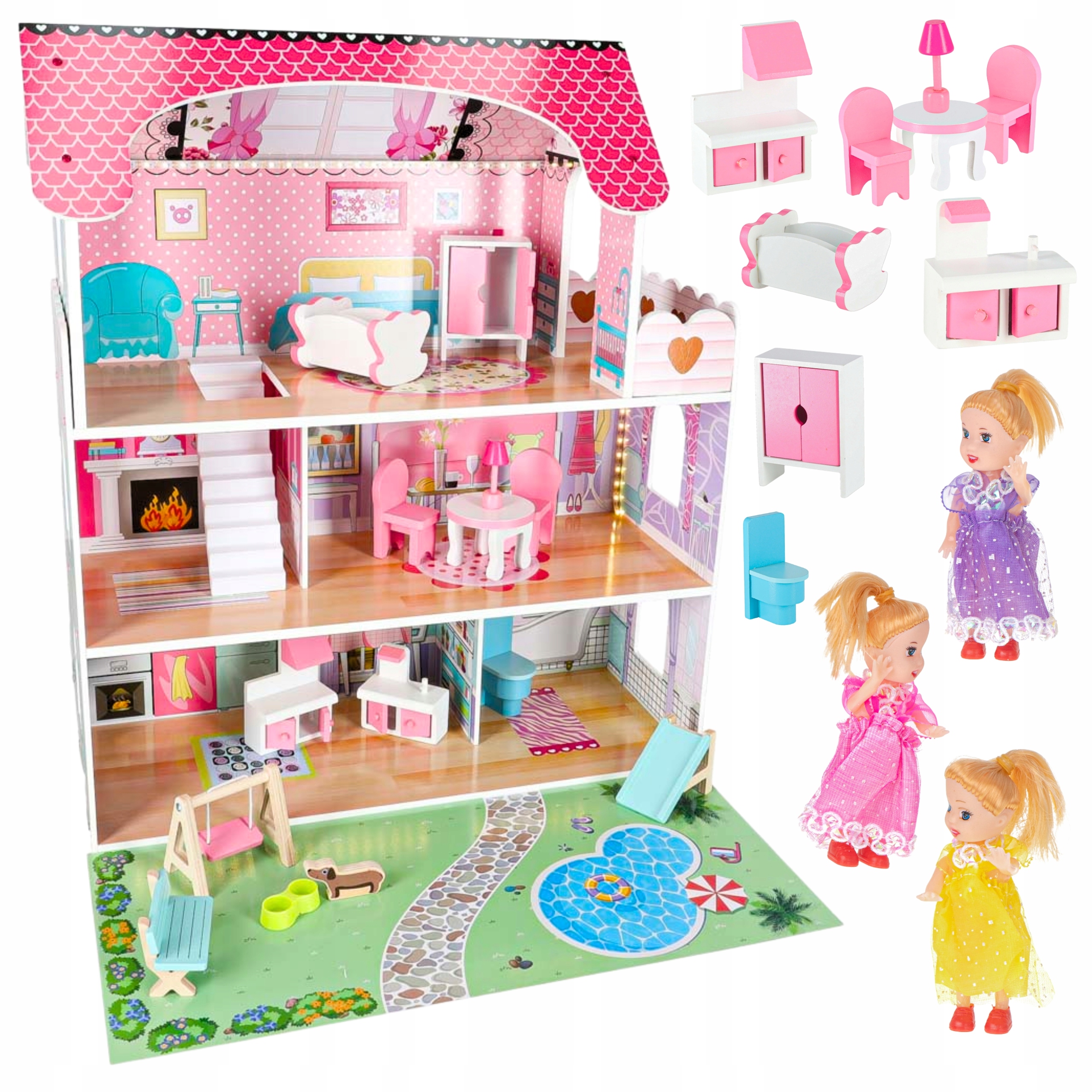 ДЕРЕВЯННЫЙ КУКОЛЬНЫЙ ДОМИК БОЛЬШОЙ XXL РОЗОВЫЙ САДОВАЯ МЕБЕЛЬ С СВЕТОДИОДНОЙ МЕБЕЛЬЮ КУКЛЫ 3 ШТ.