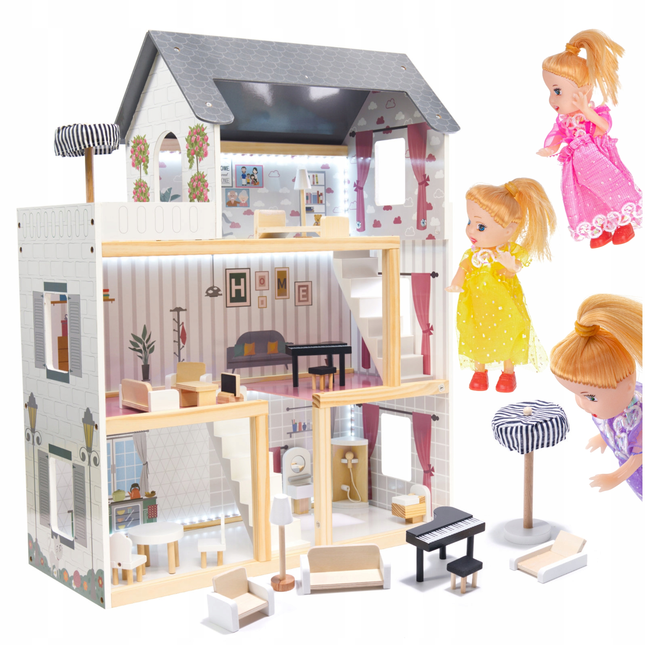 ДЕРЕВЯННЫЙ КУКОЛЬНЫЙ ДОМ ВИЛЛА СВЕТОДИОДНАЯ МЕБЕЛЬ КУКЛЫ КУКЛЫ 3 ШТ
