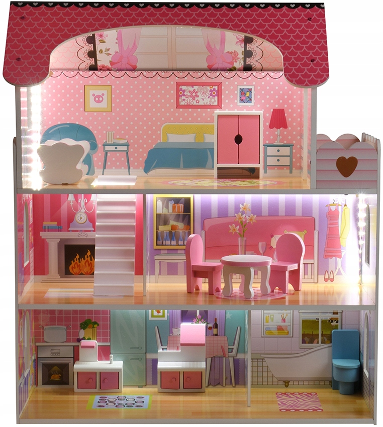 БОЛЬШОЙ ДЕРЕВЯННЫЙ КУКОЛЬНЫЙ ДОМ + МЕБЕЛЬ + СВЕТОДИОДНОЕ ОСВЕЩЕНИЕ