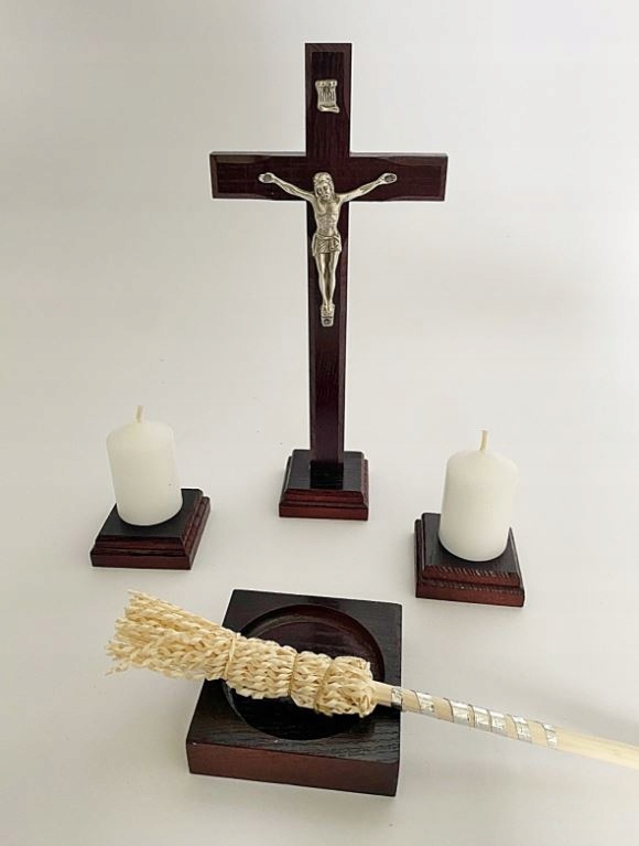 Помимо стандартных элементов колядочных наборов (крестиков, подсвечников), в коробку также входит деревянный разбрызгиватель и разбрызгиватель. деревянная чаша для святой воды.