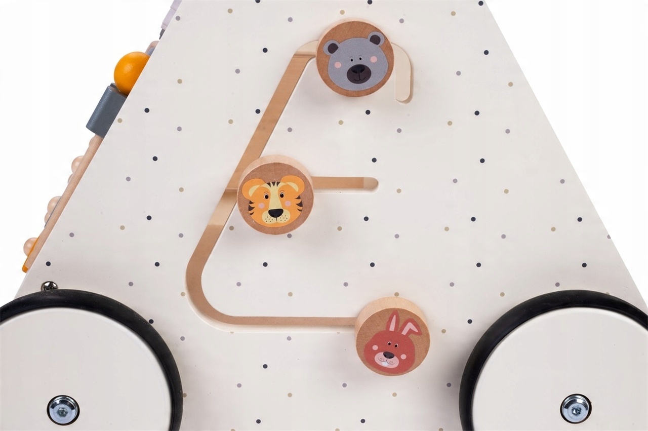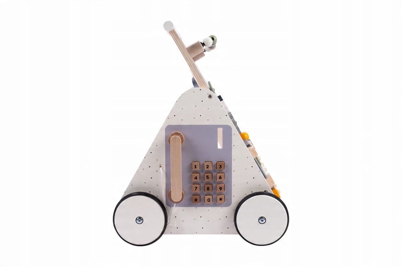 Уокер оснащен различными сенсорными и образовательными элементами, которые поддерживают моторное развитие, координацию и когнитивные способности ребенка. Благодаря стабильному дизайну, он обеспечивает безопасность, а деревянное изготовление гарантирует долговечность и экологическую альтернативу пластиковым моделям.