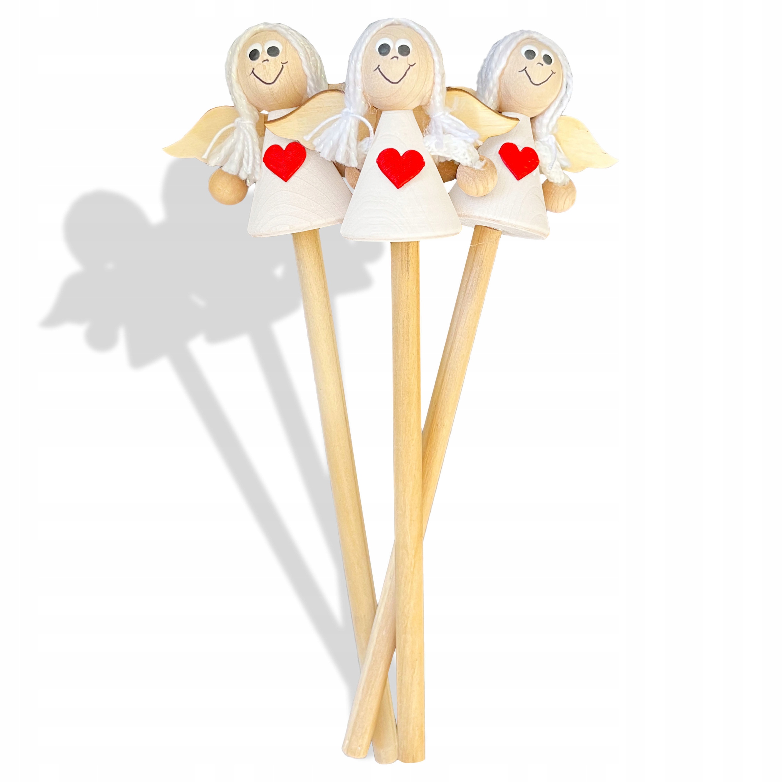 Деревянный карандаш натурального цвета с белой деревянной фигуркой ангелочка с красным сердцем.