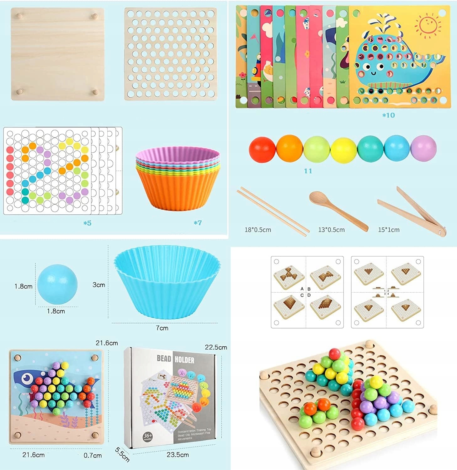 - различные способы игры - можно расставлять бусинки с помощью 3-х разных приспособлений (палочки, щипцы и ложка).