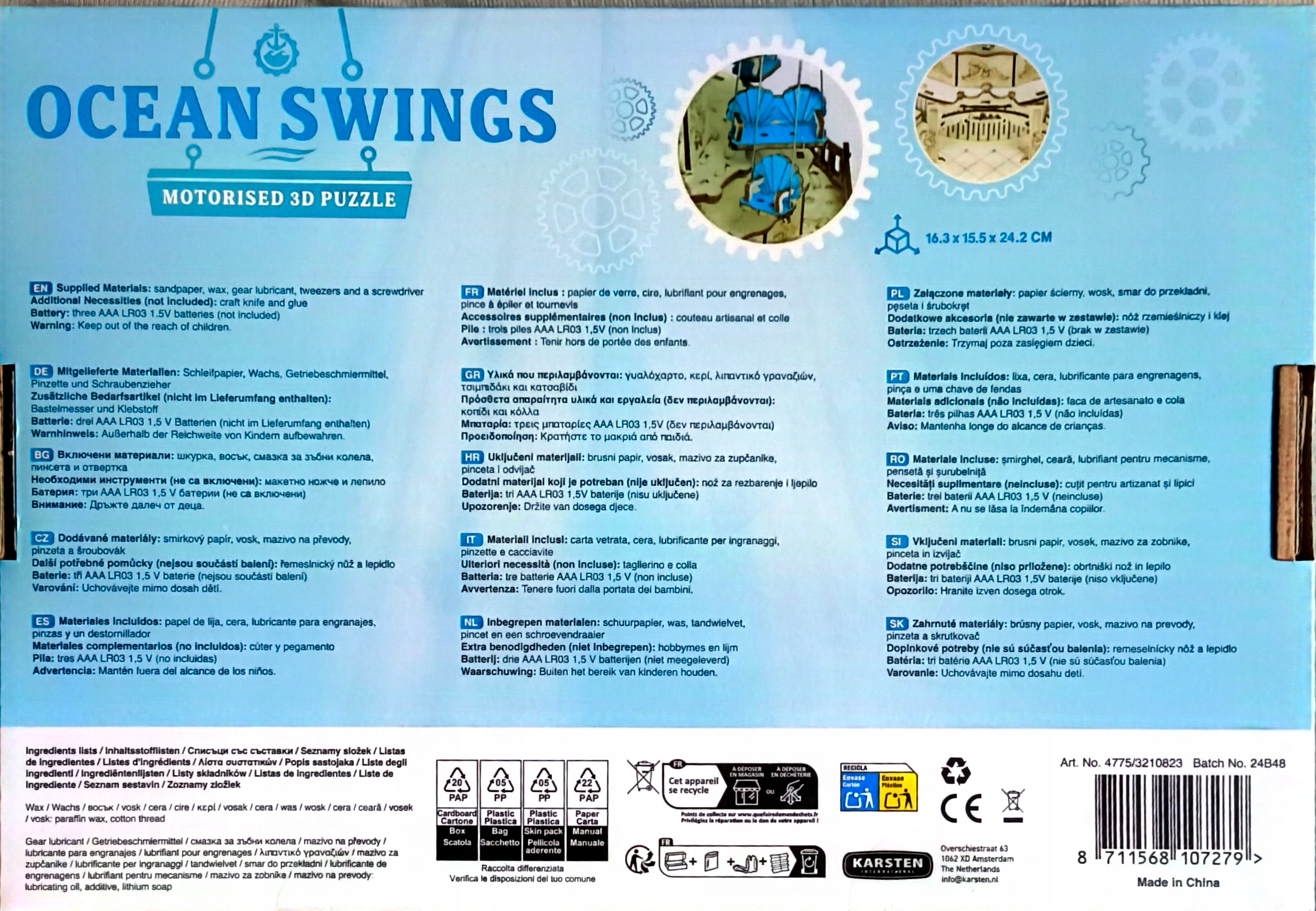 В комплект входят: листы дерева с формами для резки, наждачная бумага, воск, трансмиссионная смазка, отвертка, светодиодная подсветка