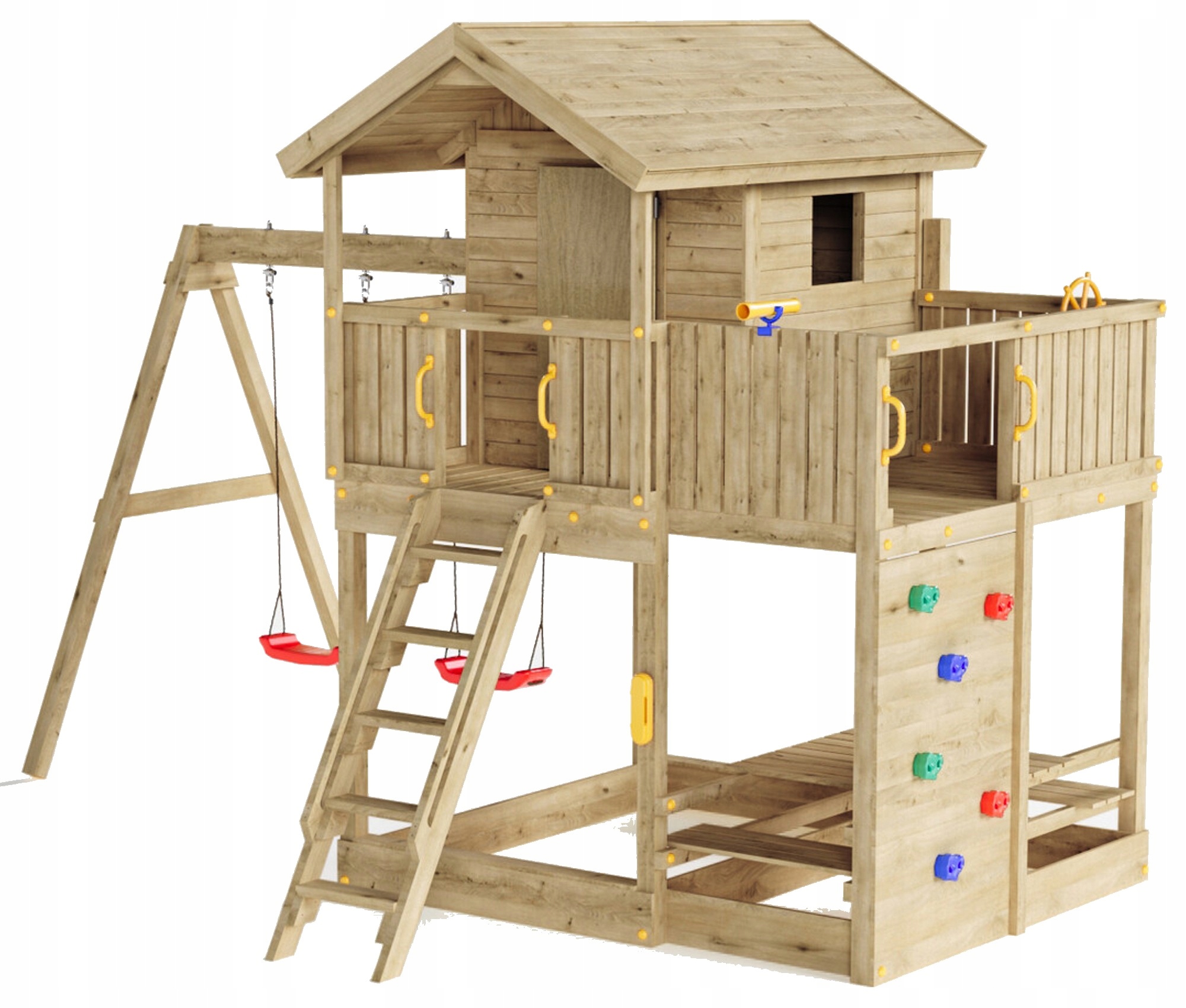 Детская площадка состоит из деревянного домика с крышей, 2-х качелей, песочницы, скалодрома, столика для пикника со скамейками, игрушечного телефона, руля. , телескоп