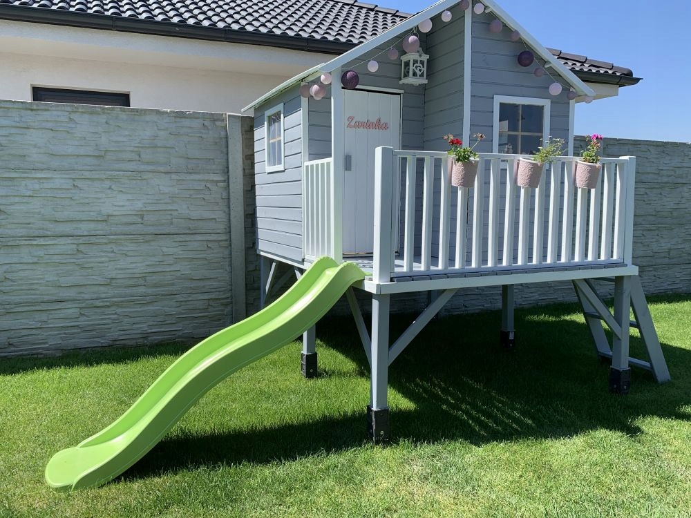- Обустроив домик горкой, вы сможете создать для ребенка целую игровую площадку, центральной частью которой будет домик.