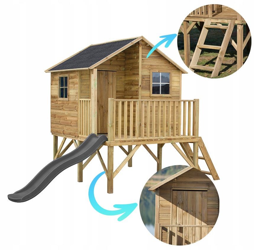 ✨ Деревянный садовый домик JERZYK 4iQ® с террасой, в комплекте с антрацитовой горкой и анкерами | Пропитанная под давлением древесина | Простота сборки | Дом можно покрасить | Пространство для детей и долгие часы отличного веселья✨