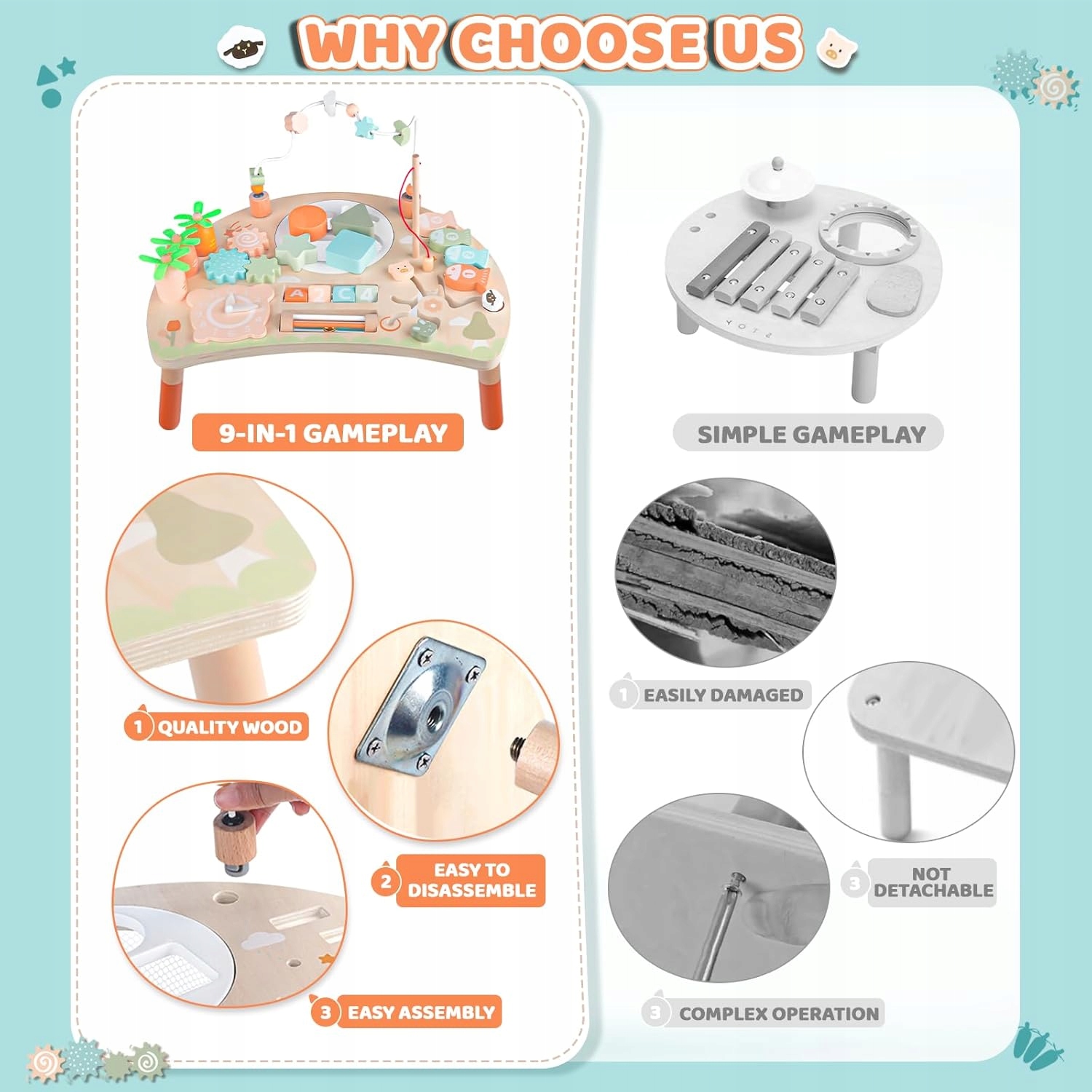 Сенсорный стол Монтессори 9-в-1: займите своего ребенка девятью интерактивными обучающими станциями на одном прочном деревянном столе - лабиринтом из бусинок, магнитной ловушкой для рыбы, обучающими часами, вращающимися шестеренками, сортировщиком фигур, лабиринтом с животными, сбором моркови, вращающимися кубиками и погремушкой - для бесконечного веселья и открытий.