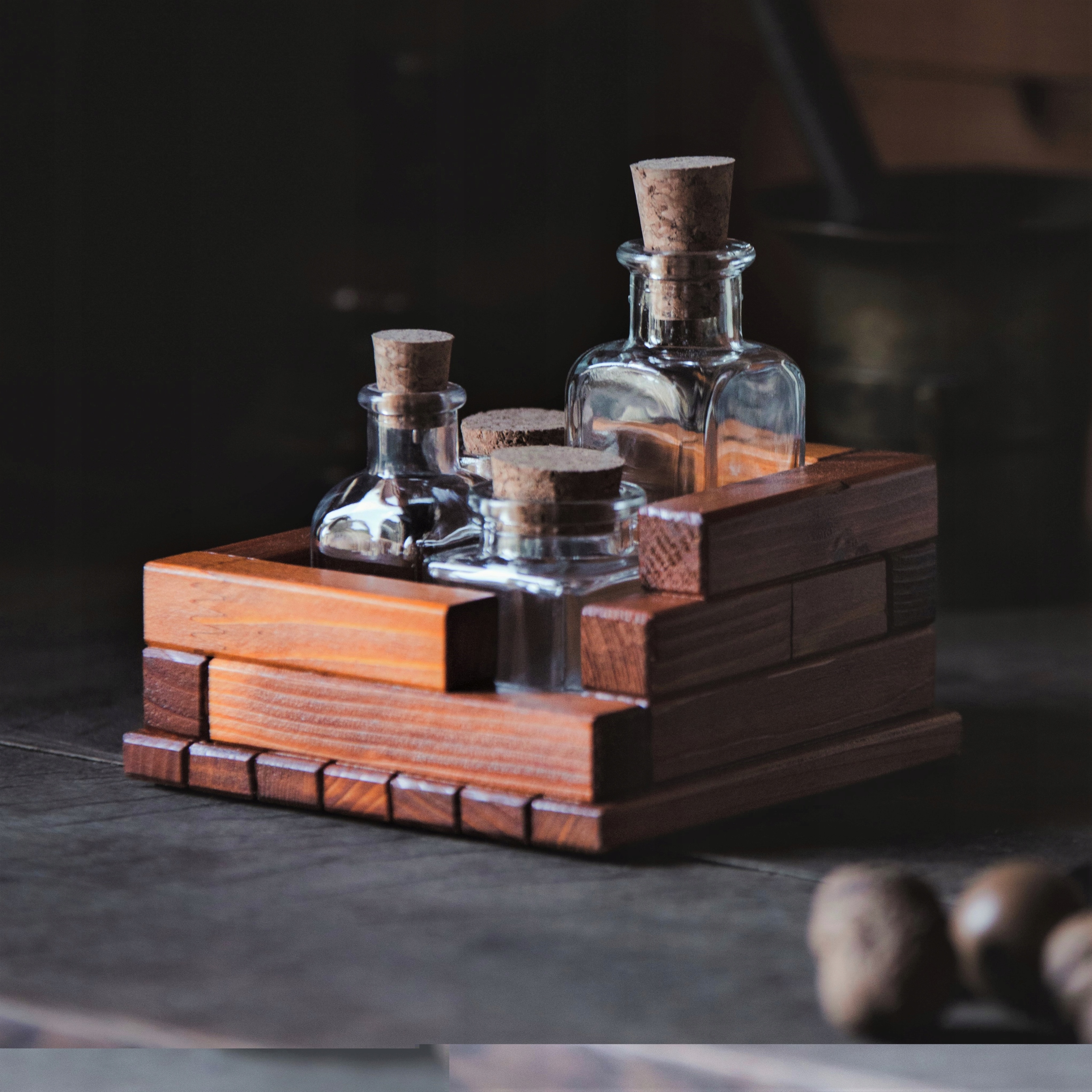 Деревянное стекло специи. Каждый продукт представляет собой комбинацию отдельных, подключенных деревянных модулей. Этот общий знаменатель позволяет вам свободно объединять отдельные аксессуары в наборы, как часть каждой из предлагаемых коллекций.