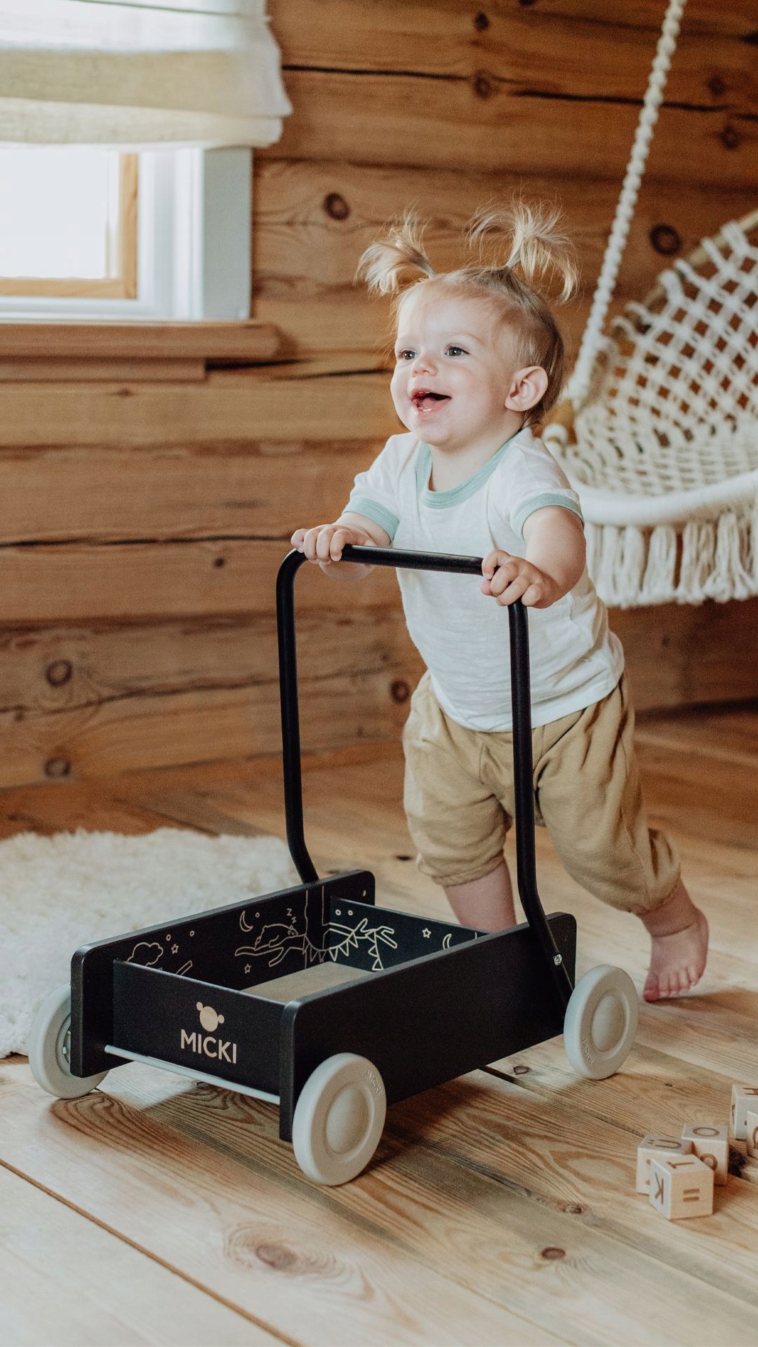 Классические ходунки Micki из нашей премиум-серии! Черный толкатель обеспечивает устойчивую и надежную поддержку первых шагов ребенка, имеет колеса с тормозами и регулируемую ручку. Как только ваш ребенок научится ходить, ручку можно будет отрегулировать, и коляска превратится в кукольную коляску, которой можно будет пользоваться долгие годы. Может быть, кубики нужно куда-то перевезти, или мишка хочет погулять?