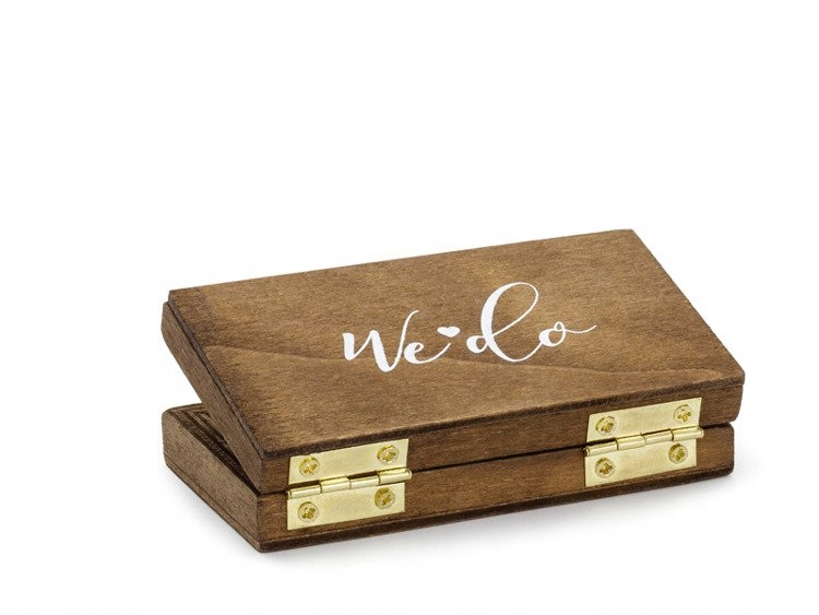 Деревянная шкатулка для обручальных колец с белыми надписями.