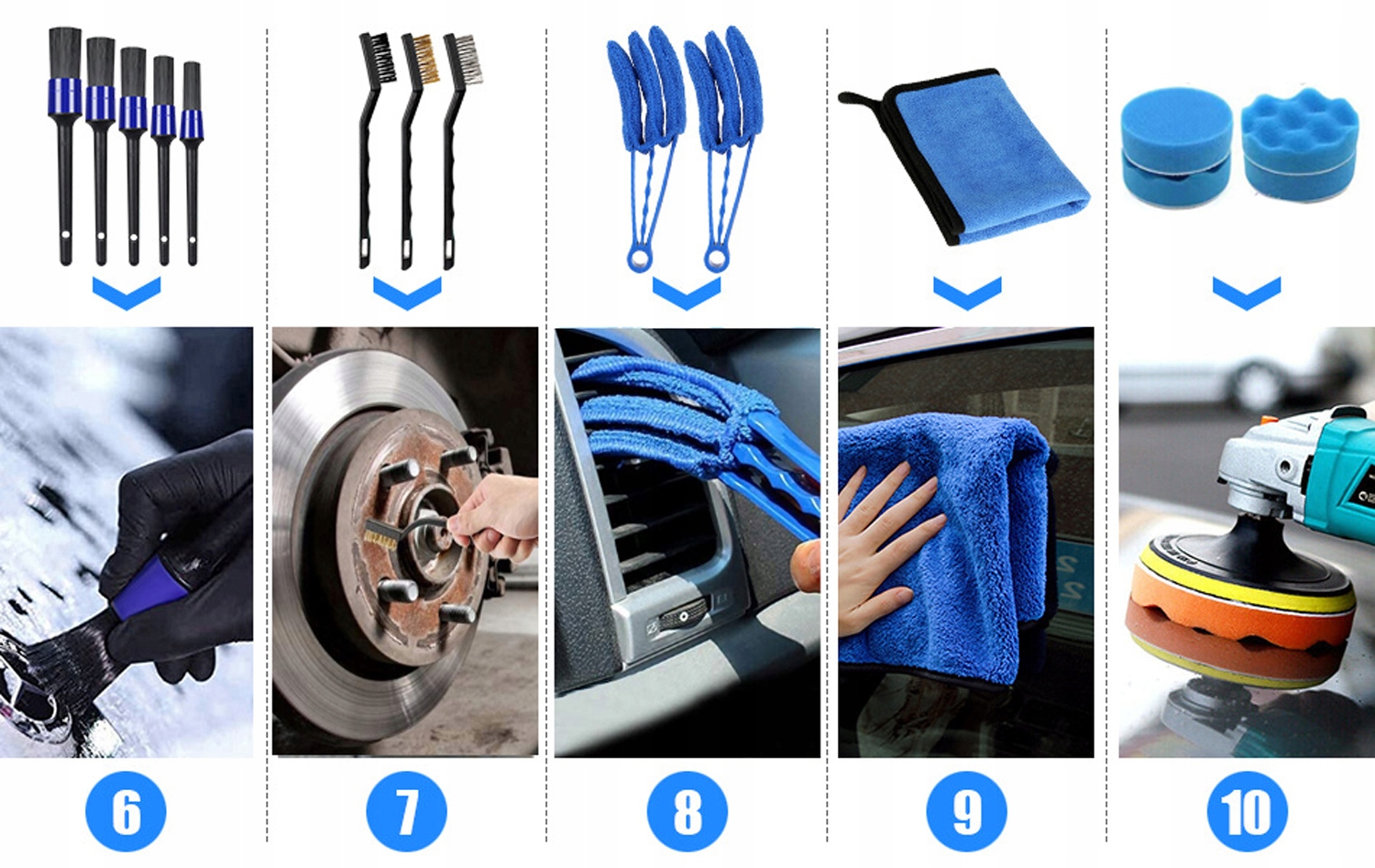 - Универсальность: В комплект входят щётки для чистки каждого элемента автомобиля.