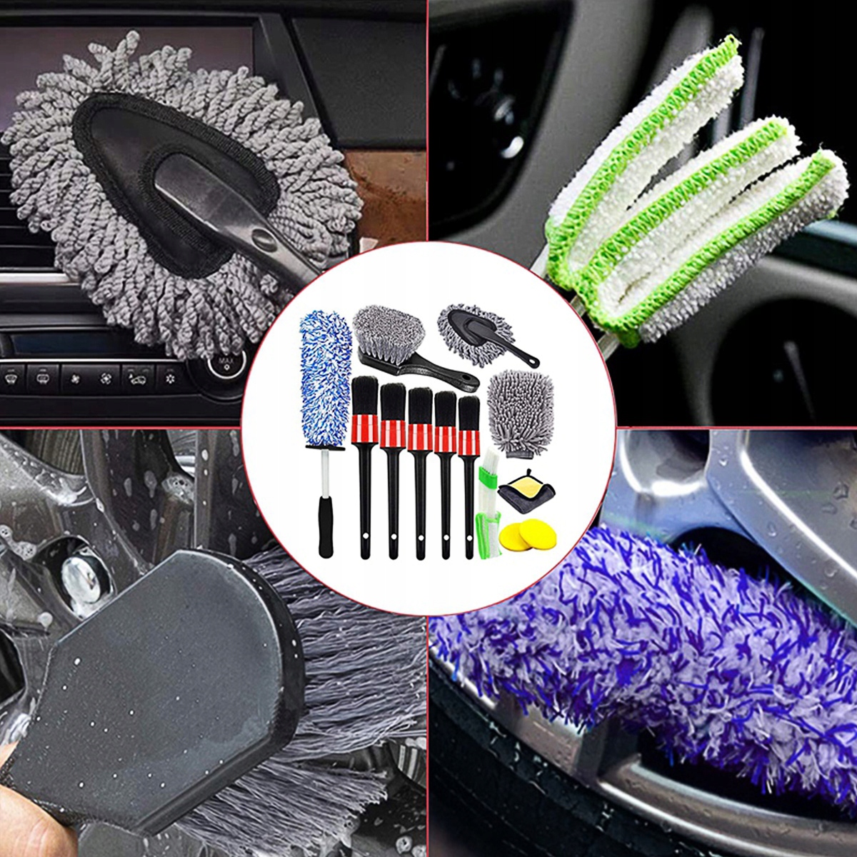 В комплект для чистки деталей автомобиля входят: 1 щетка для длинного обода/щетка из микрофибры для колес, 5 щеток для деталей автомобиля, 1 универсальная щетка для шин, 1 автомобильная щетка с пером, 1 перчатка из микрофибры для автомойки, 1 полотенце из микрофибры 1200GSM (30*30 см)), 2 подушечки для нанесения воска, 1 щетка для кондиционера автомобиля. Идеальный набор для чистки автомобиля, отвечающий всем вашим потребностям в чистке автомобиля.