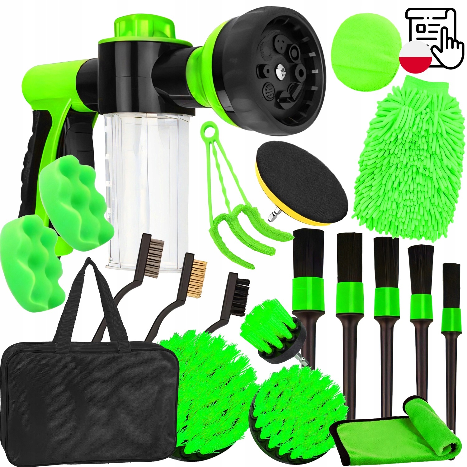 Благодаря широкому диапазону инструментов, включая кисти, кисти и губки различных форм и размеров, Набор позволяет точно очистить как внутреннее, так и внешние части автомобиля