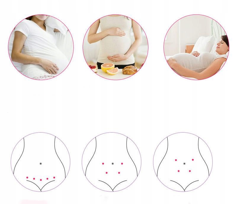 Второй триместр (24–14 недель). 32 недели) - посмотрите на среднюю линию и бока живота (ниже пупка)