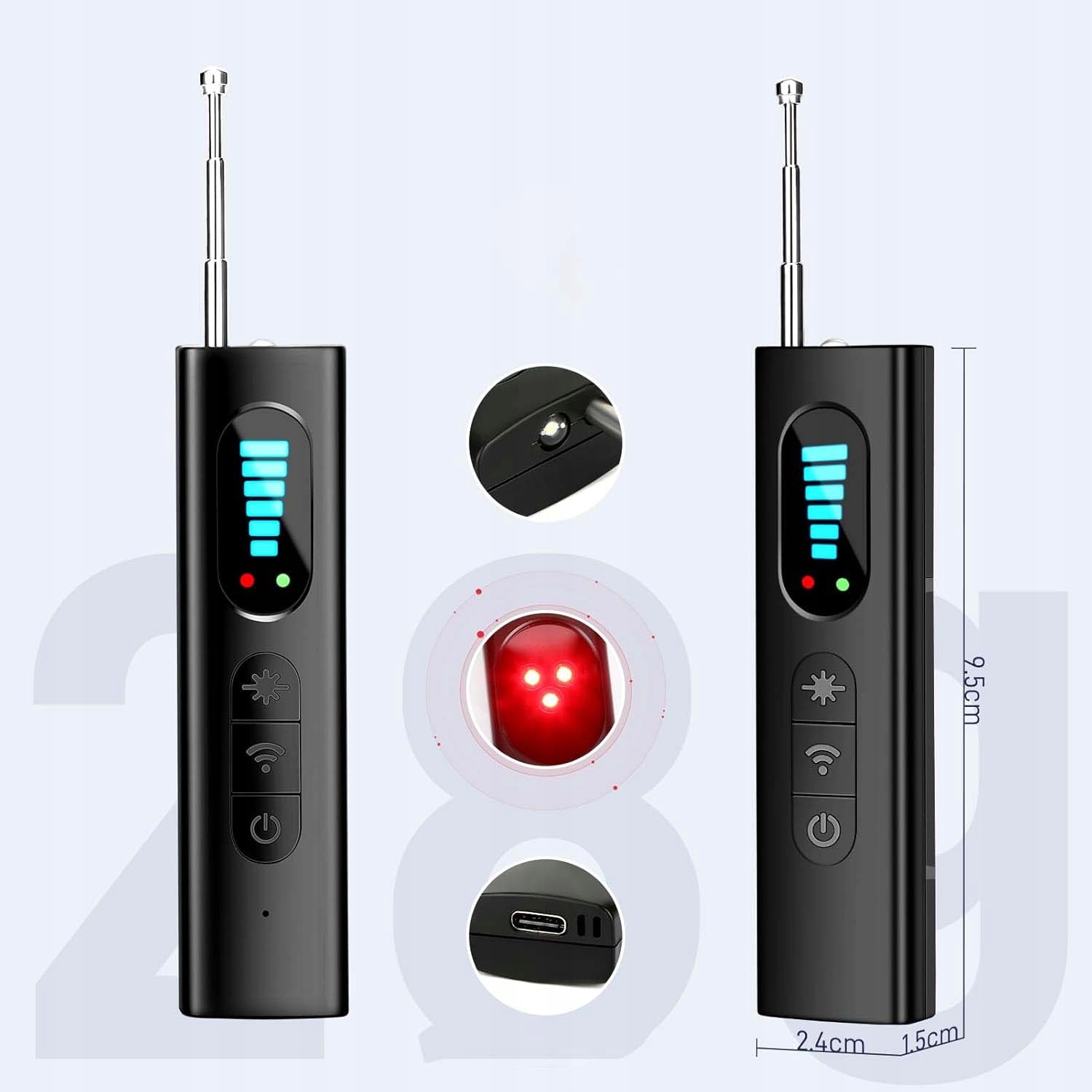 - - Режим поиска объектива камеры, который может найти скрытые отверстия с простым визуальным осмотром, используя инфракрасное лазерное сканирование; Режим обнаружения радиочастотных сигналов, который может обнаруживать активные радиочастотные передатчики, такие как передача камеры, локаторы GPS, беспроводной аудио -пройрет; Режим обнаружения вибрации противоугонной тревоги.