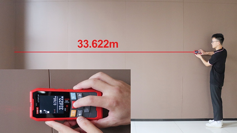 Встроенный дальномер позволяет измерять расстояния до 20 м, а в случае отражающих поверхностей — примерно до 40 м с автоматическим расчетом площади. Устройство также может рассчитывать высоту по теореме Пифагора, измеряя одну сторону и гипотенузу. Дополнительно есть возможность производить расчеты: складывать и вычитать измеренные значения, дальнейшее измерение расстояний, площадей, высот в прямоугольном треугольнике и перевод единиц измерения.